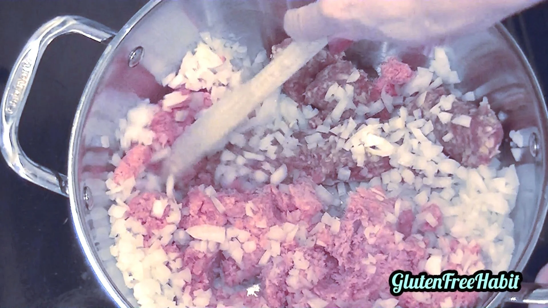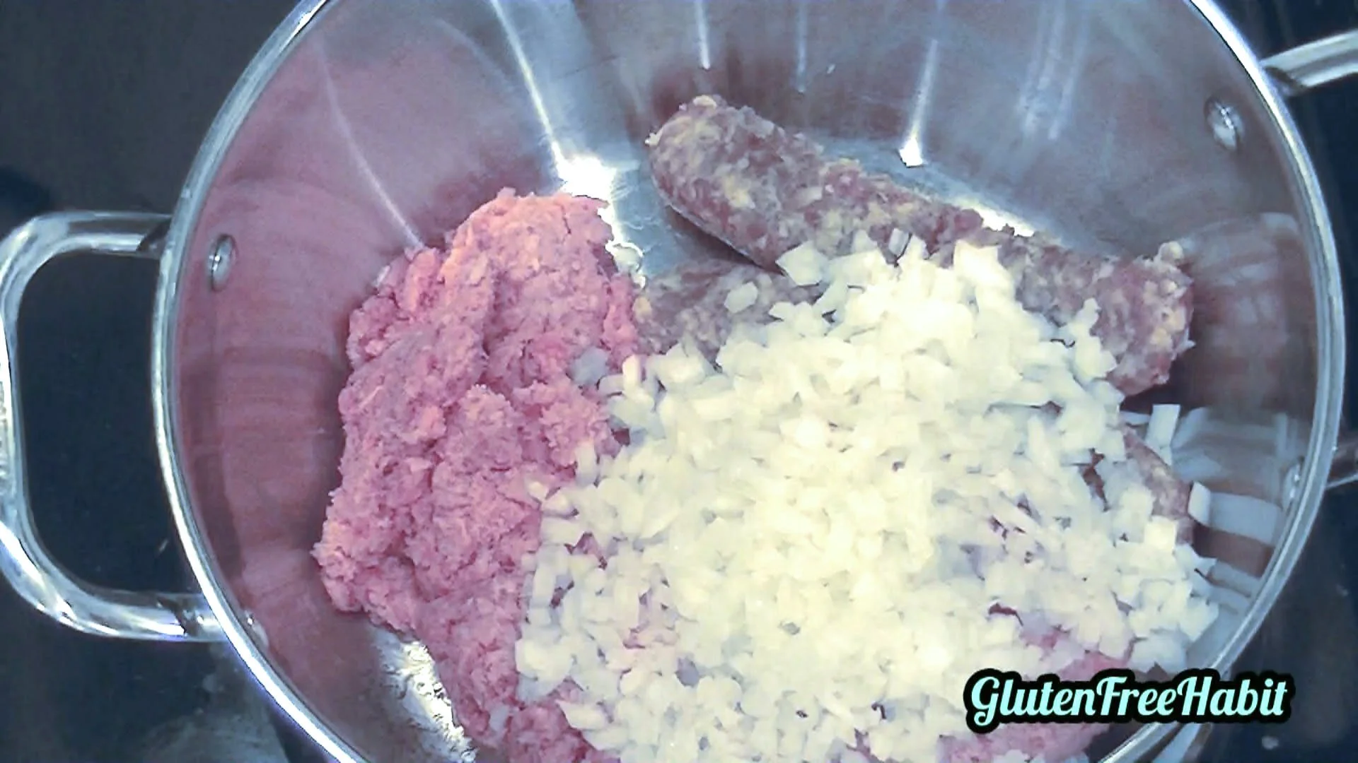 Cook beef, sausage, onion, and garlic over medium heat.