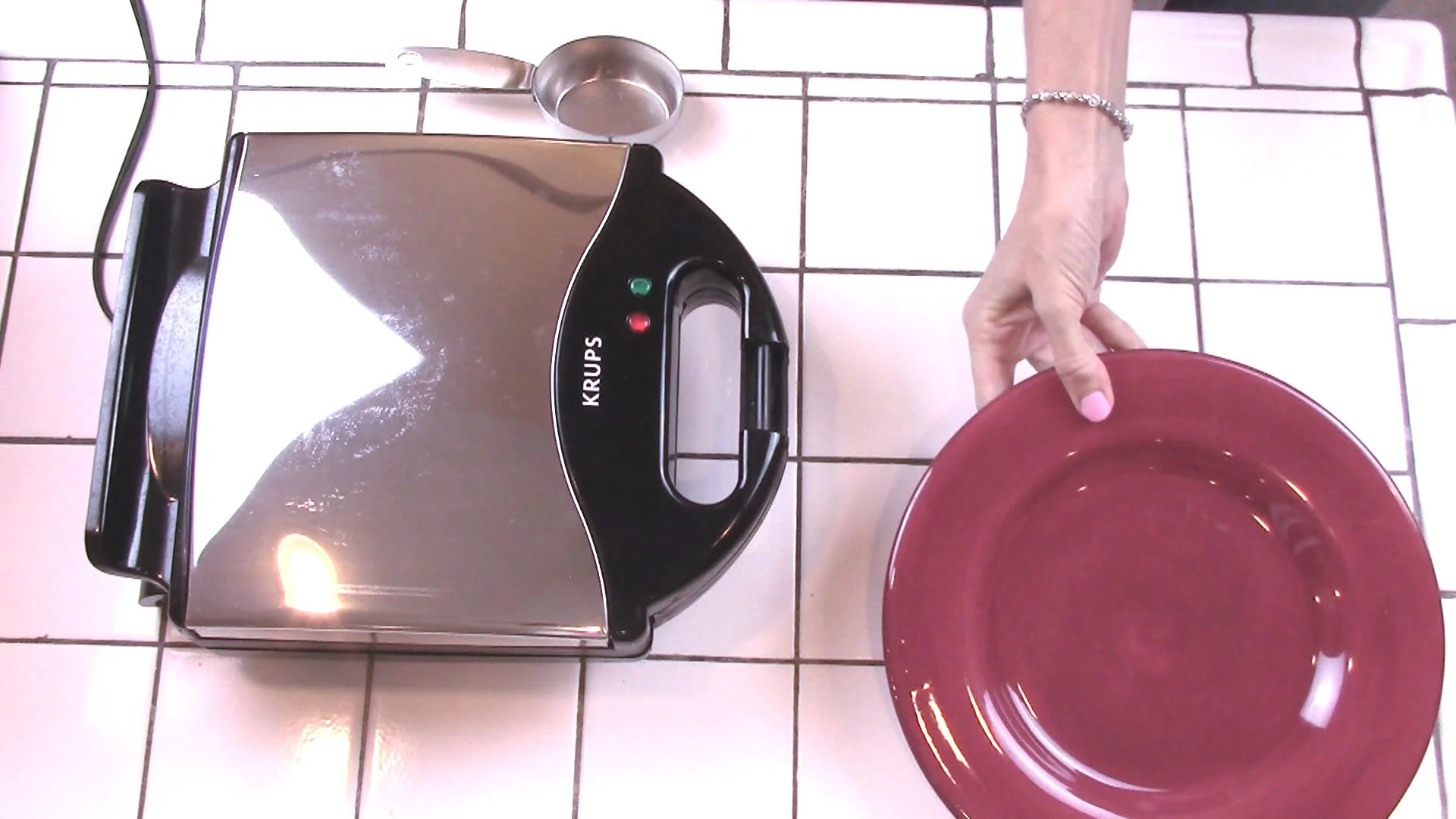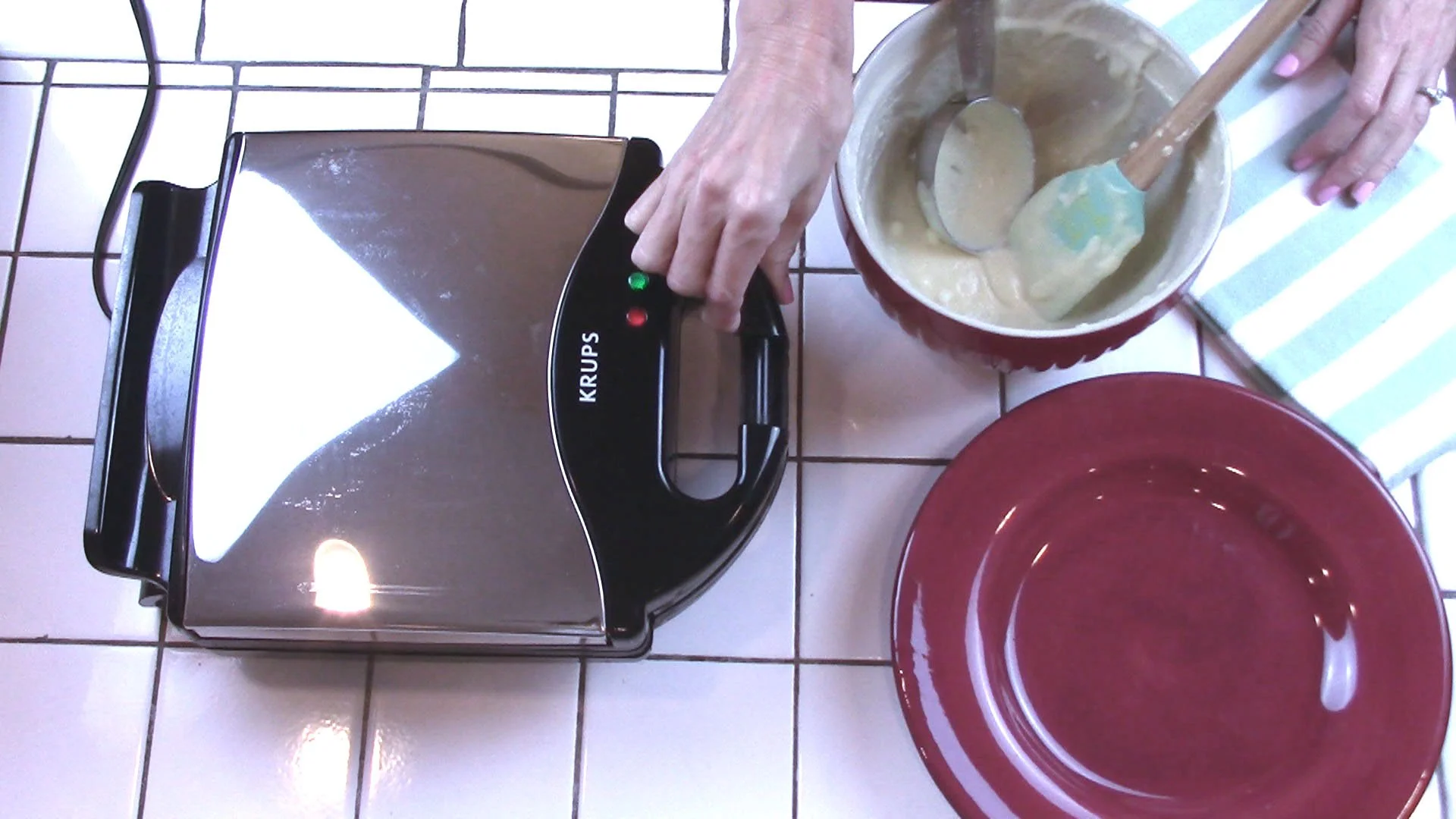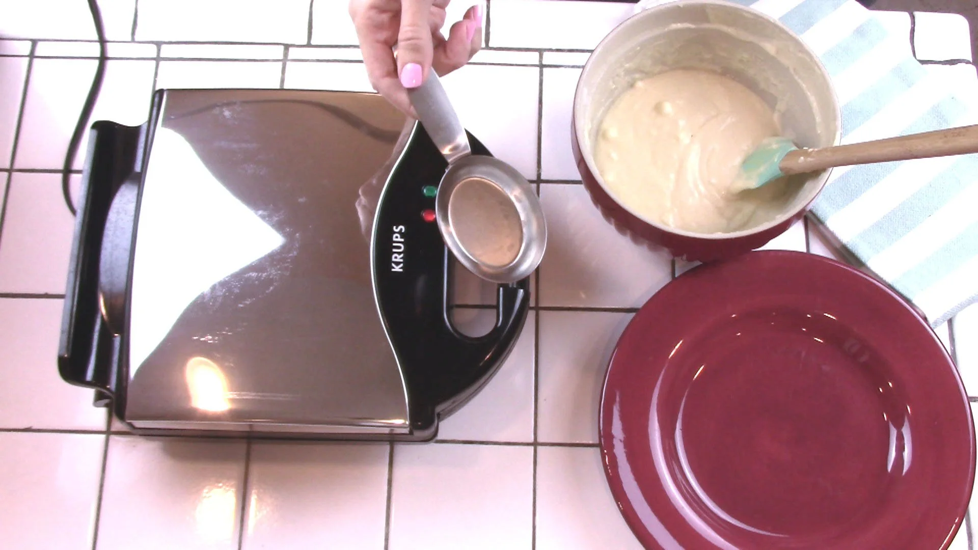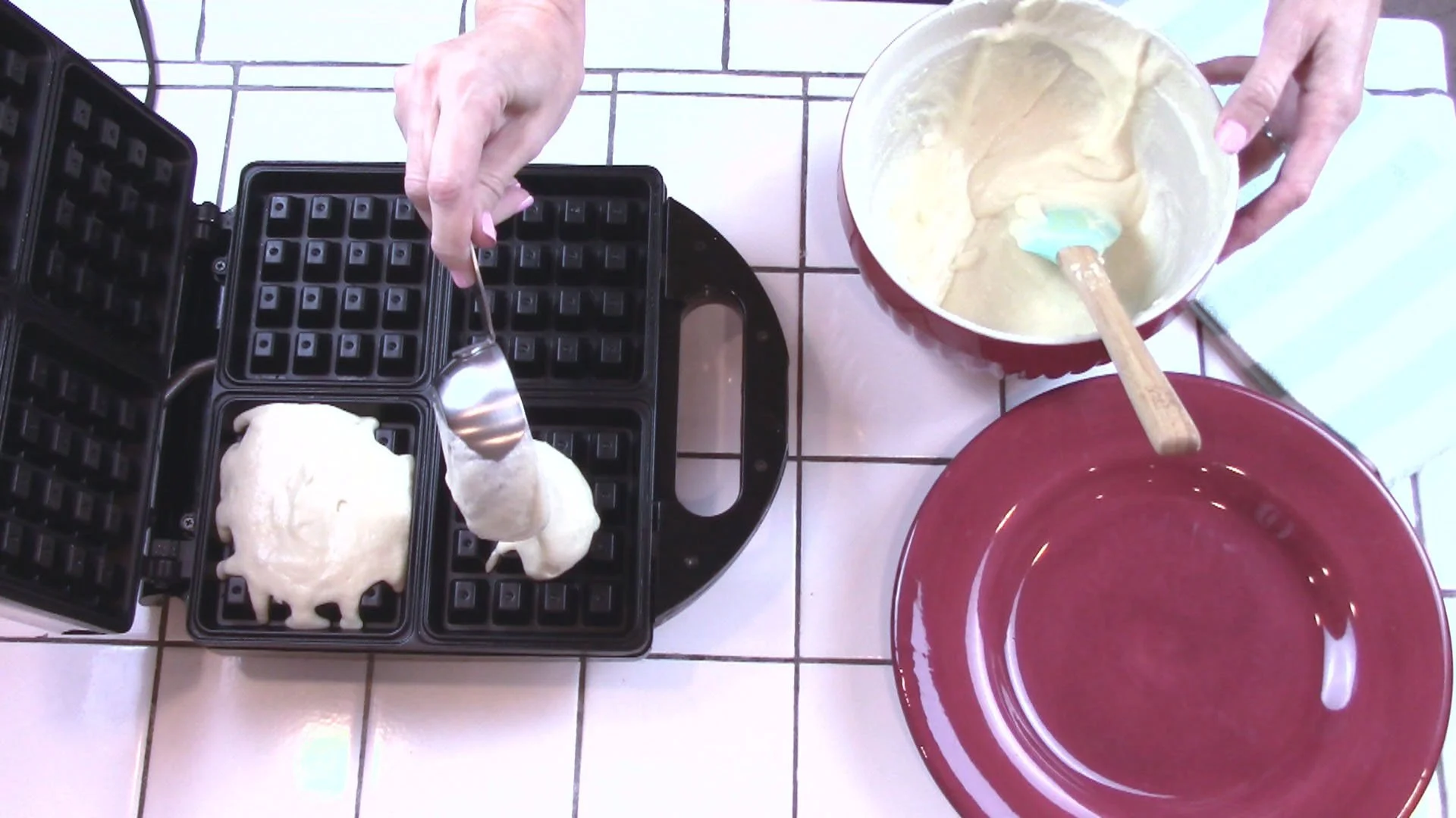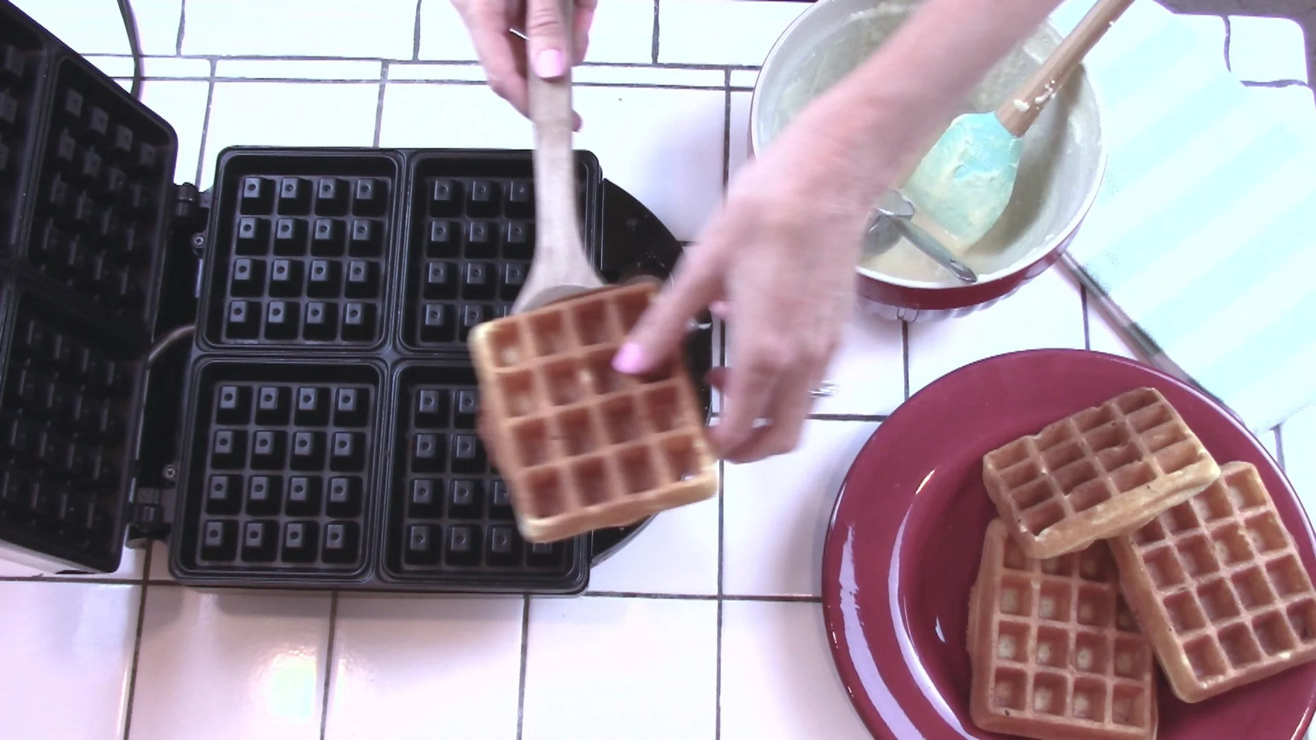 Set out a plate for cooked waffles.