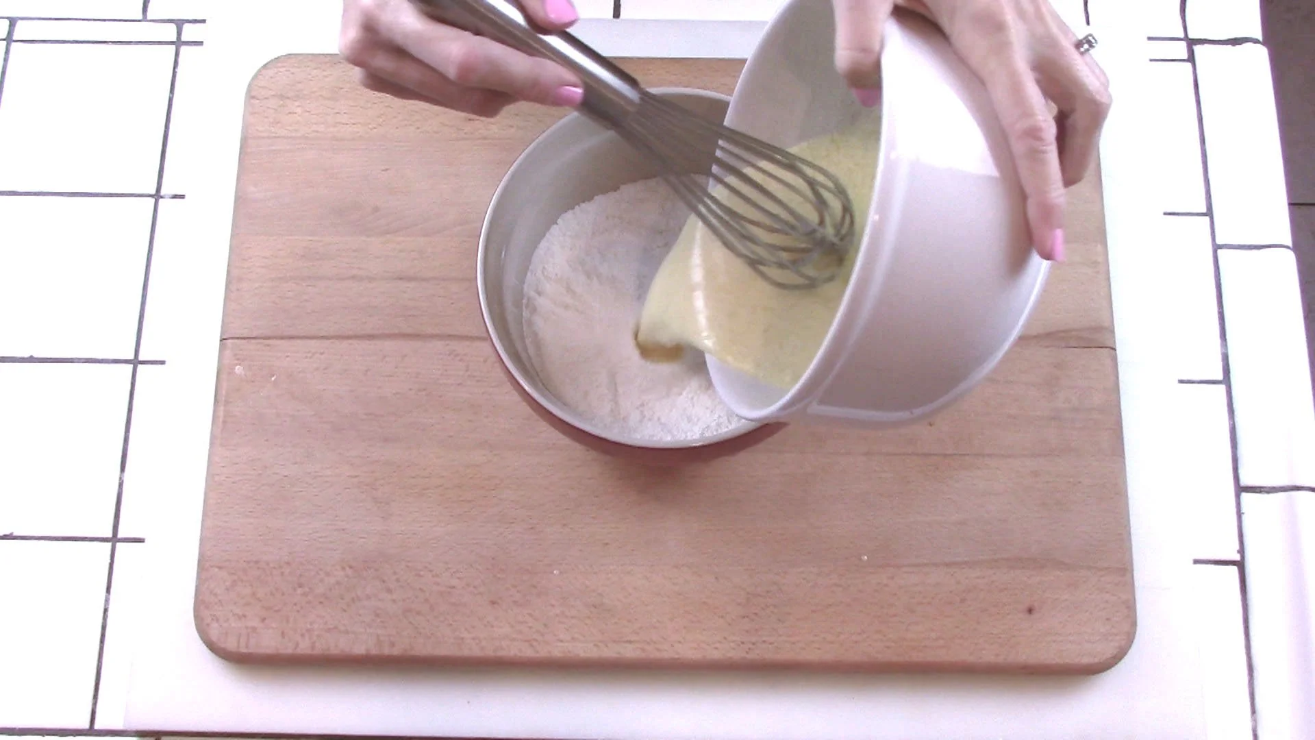 Pour wet mix into the dry mix and whisk by hand until well blended.