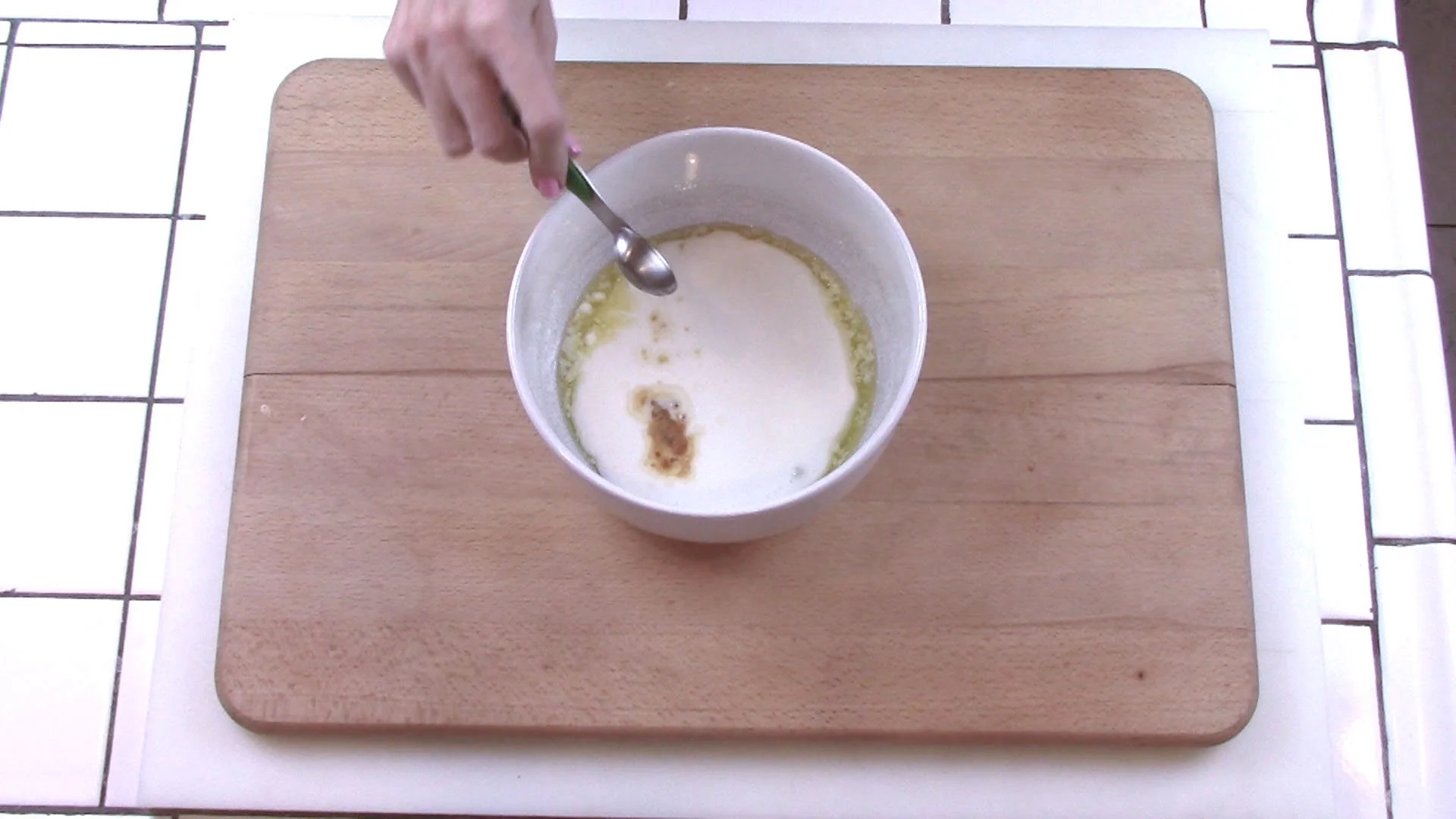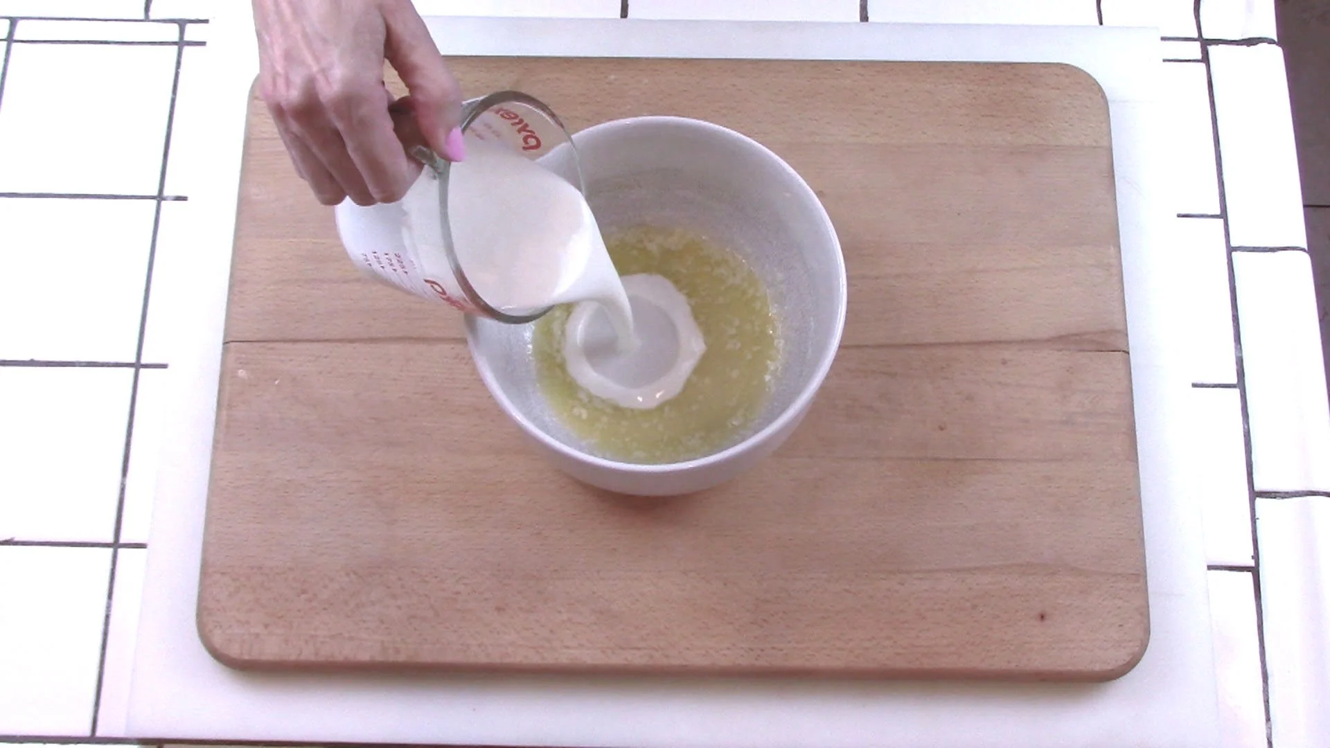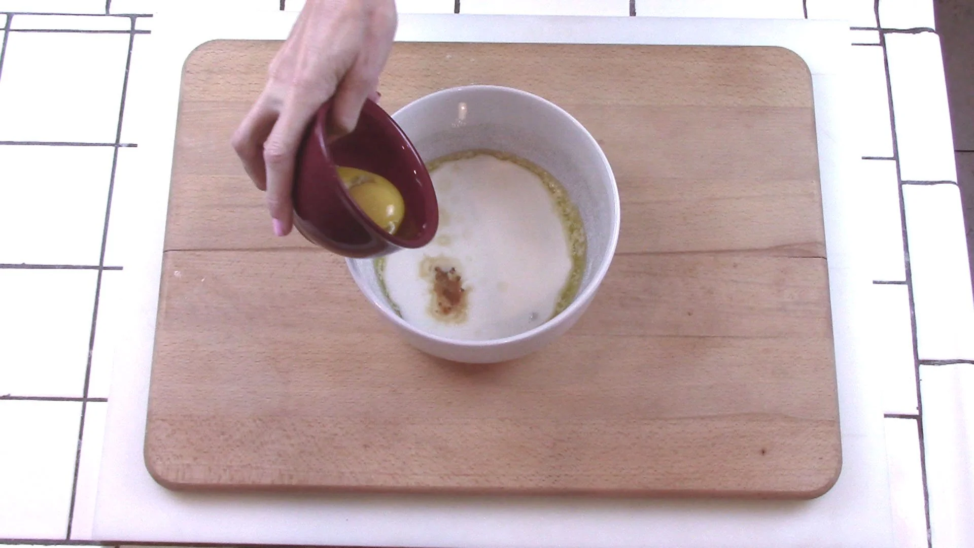 When butter is cooled, add to it the buttermilk, vanilla, and yolks. Stir or whisk by hand.