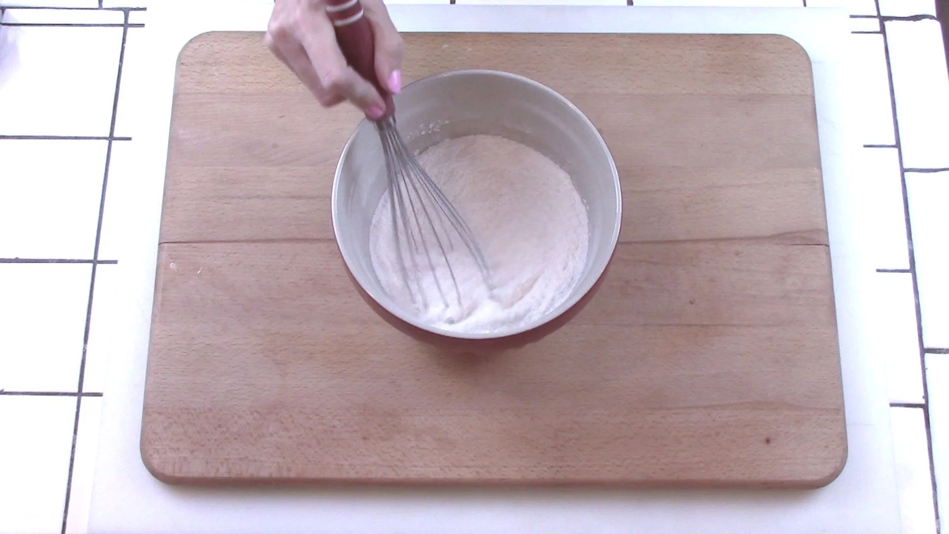 Into a medium-sized mixing bowl, add all dry ingredients: white rice flour, tapioca flour, brown rice flour, cornstarch, baking soda, baking powder, salt, and sugar.