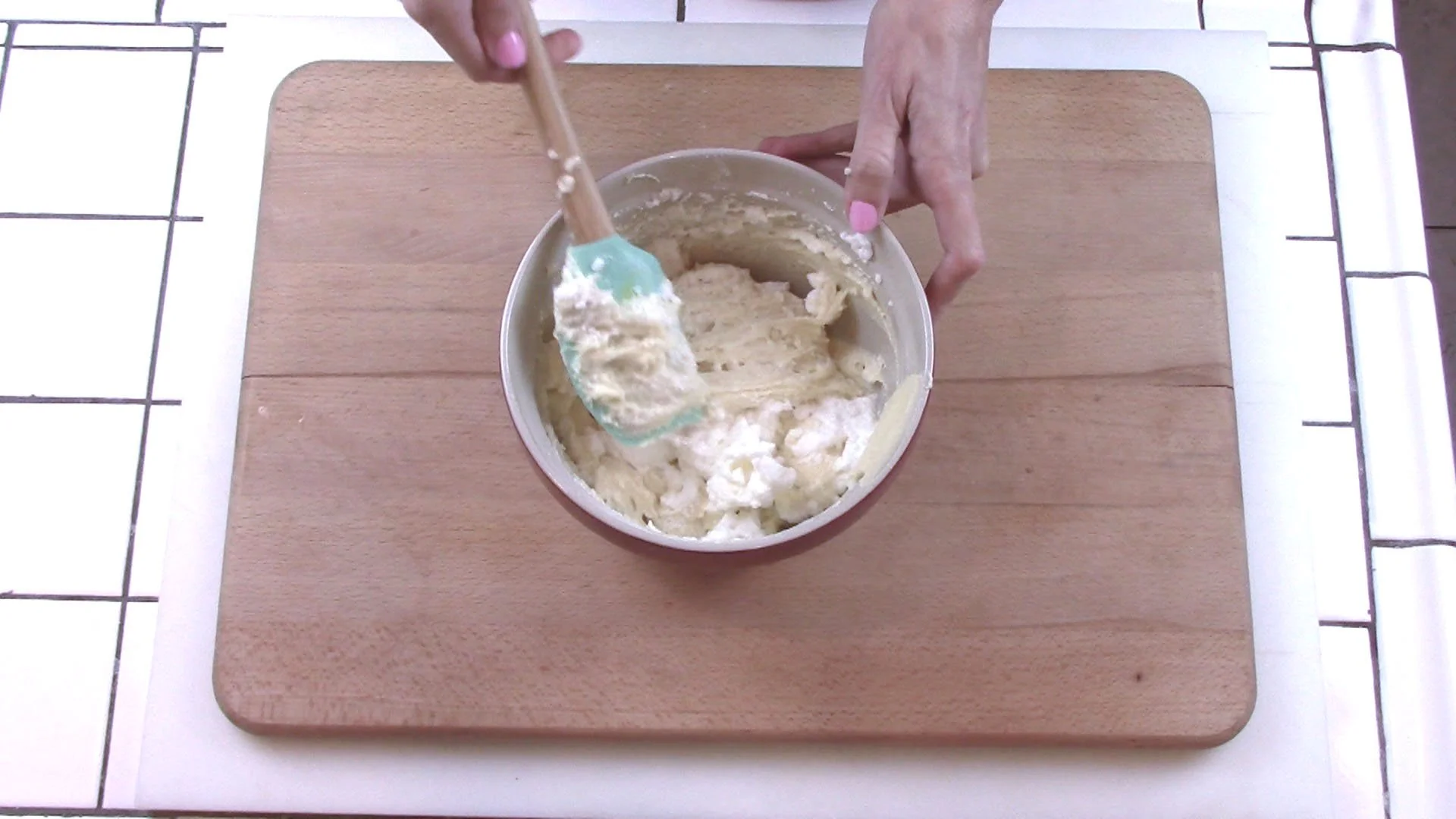 Gently fold egg whites into batter with a rubber spatula.