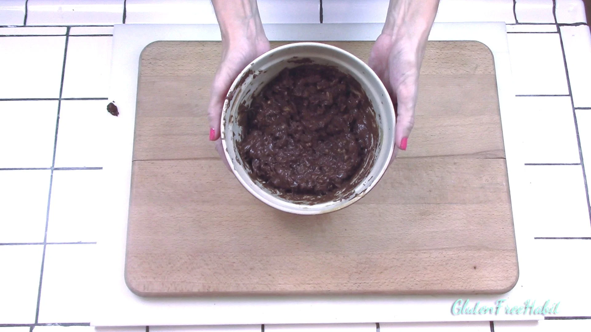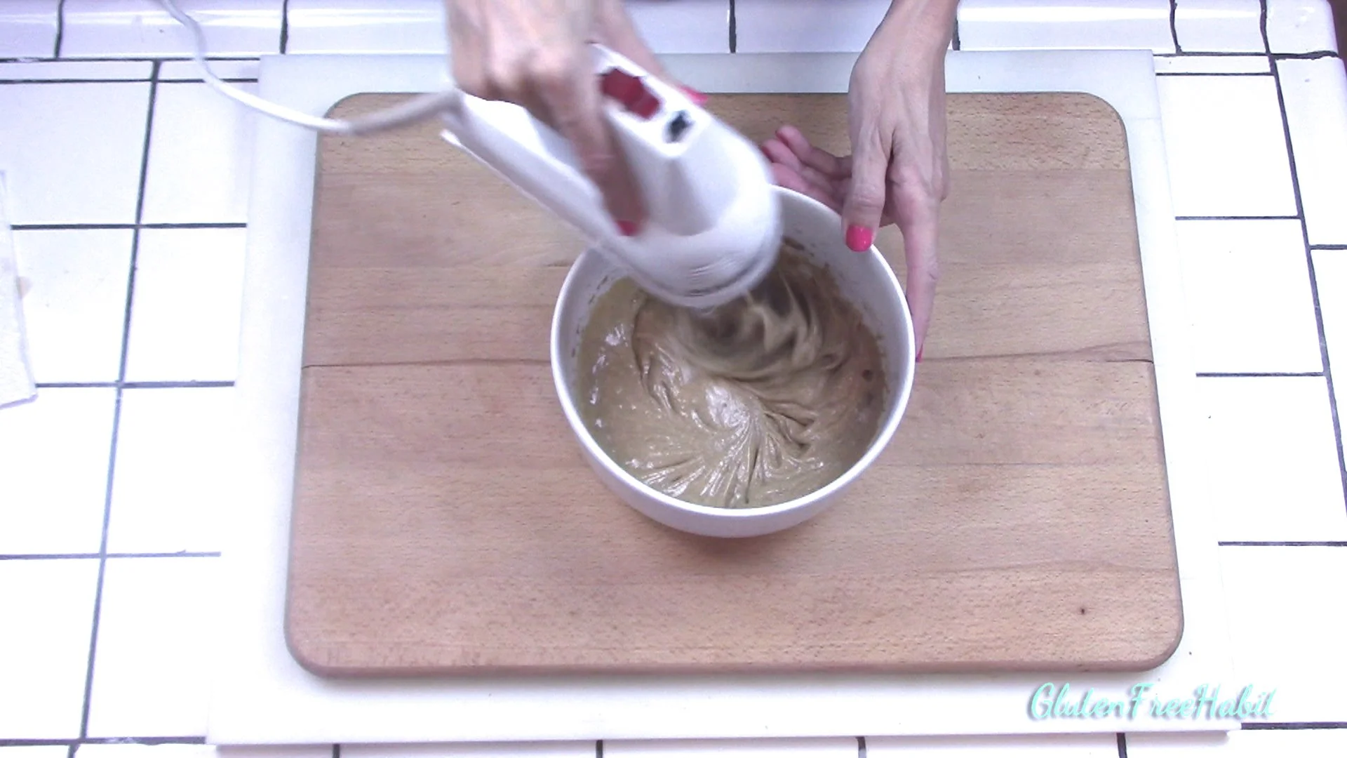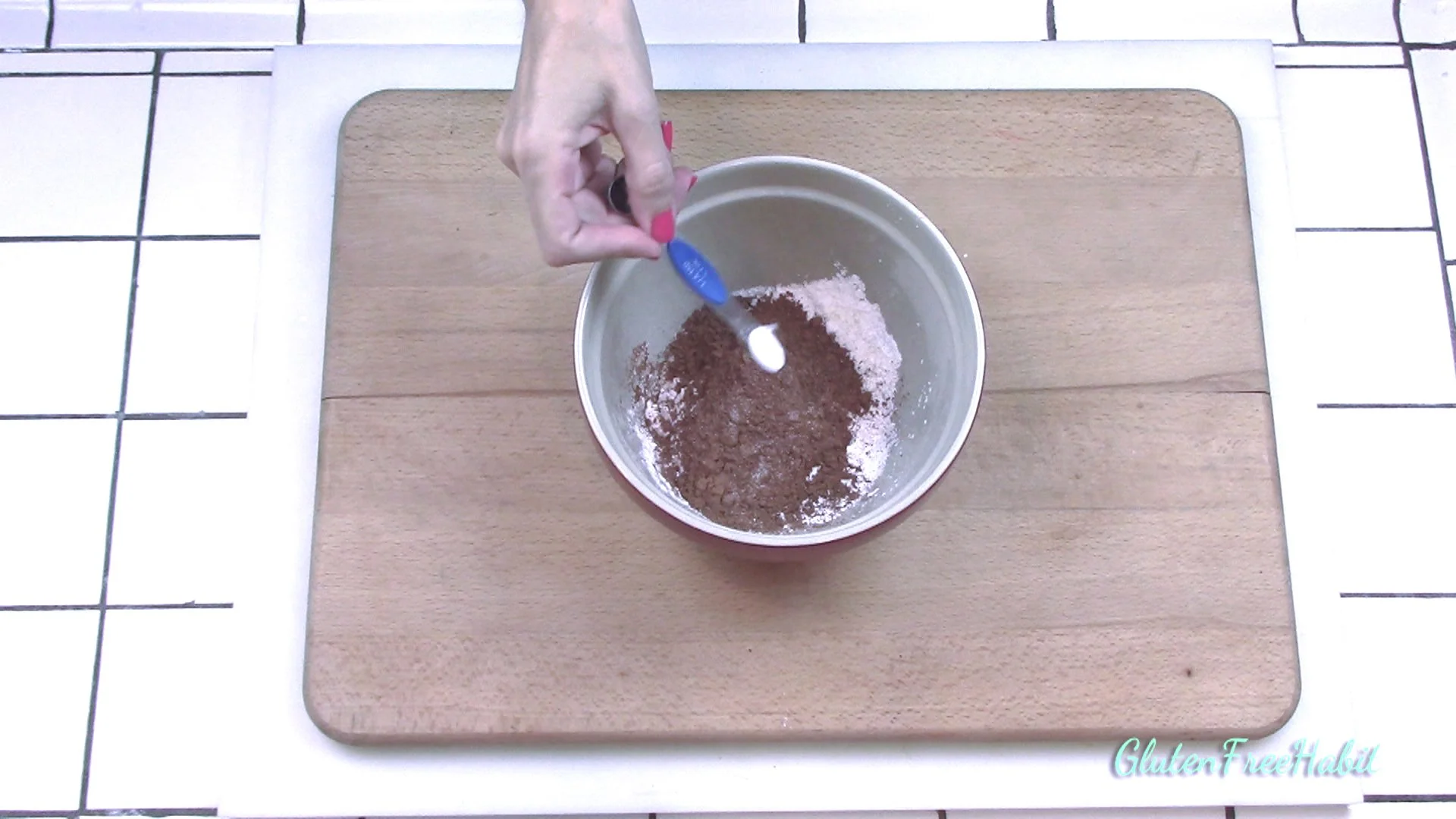 Combine your dry ingredients: Set out a medium-sized bowl and whisk together the white rice flour, brown rice flour, tapioca flour, cocoa powder, salt, baking soda, and xanthan gum. Set aside.