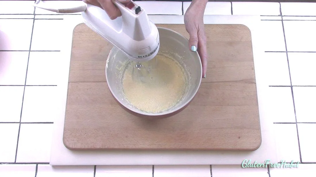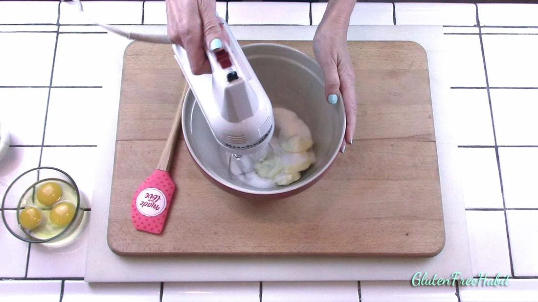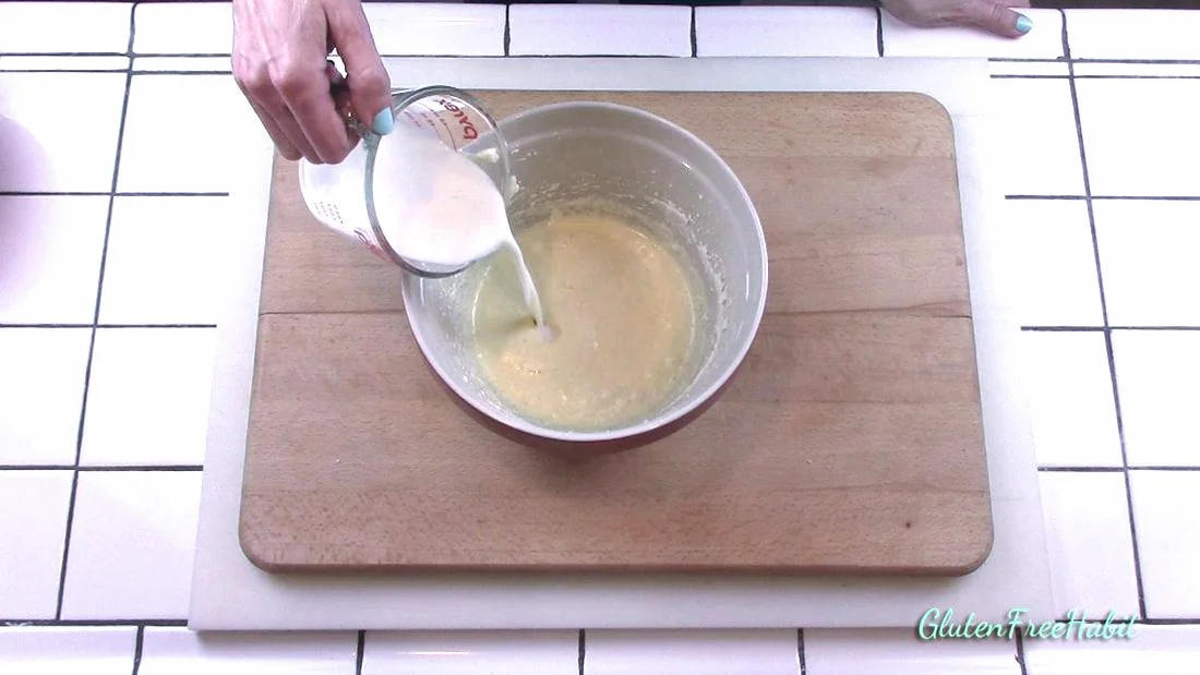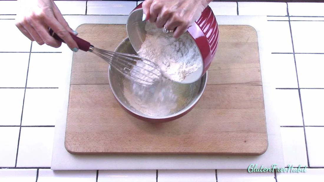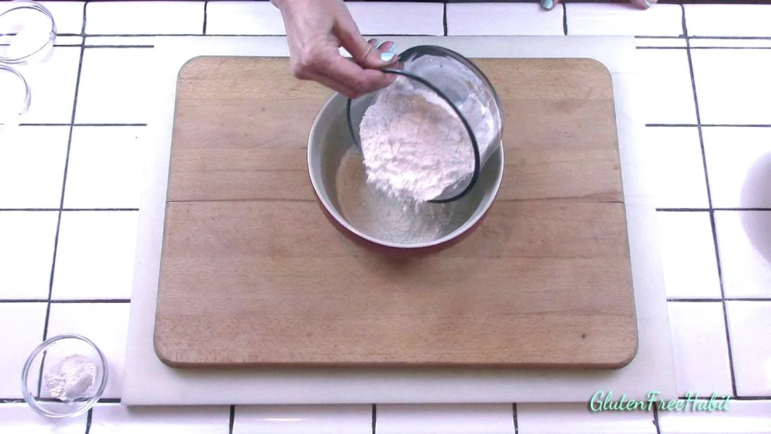 In a medium-sized mixing bowl, using the measurements from the “Dry mixture” section above, whisk together the white rice flour, brown rice flour, tapioca flour, baking powder, salt, and xanthan gum. Set aside.