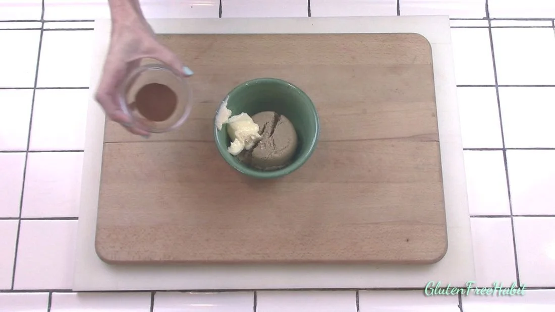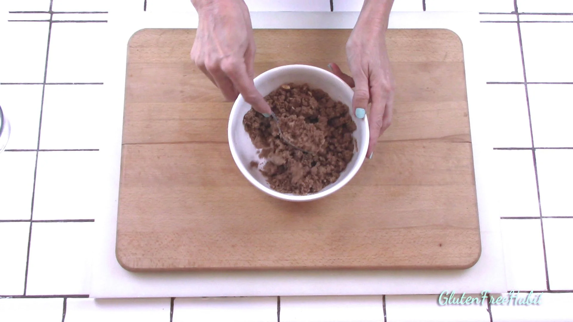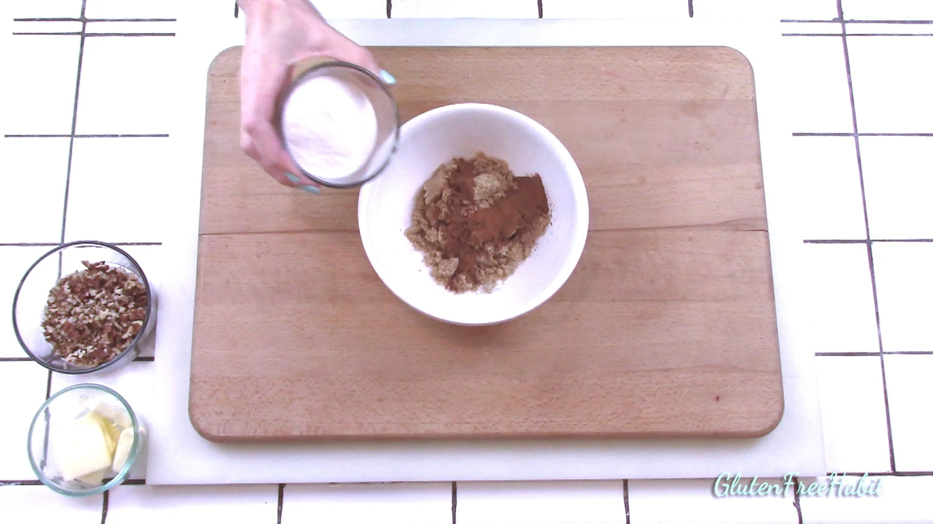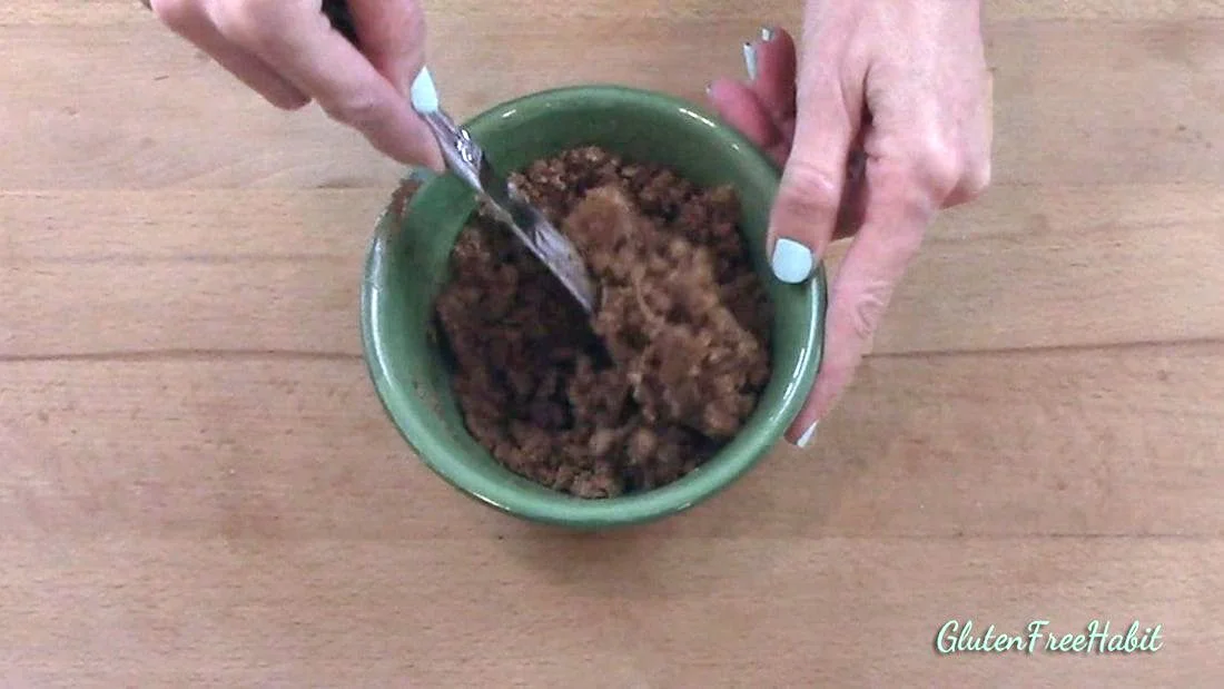 Prepare the Topping as follows: Using measurements in the “Topping” section above, in a small bowl, stir together the brown sugar, pecans, white rice flour, cinnamon, and butter. Set aside.