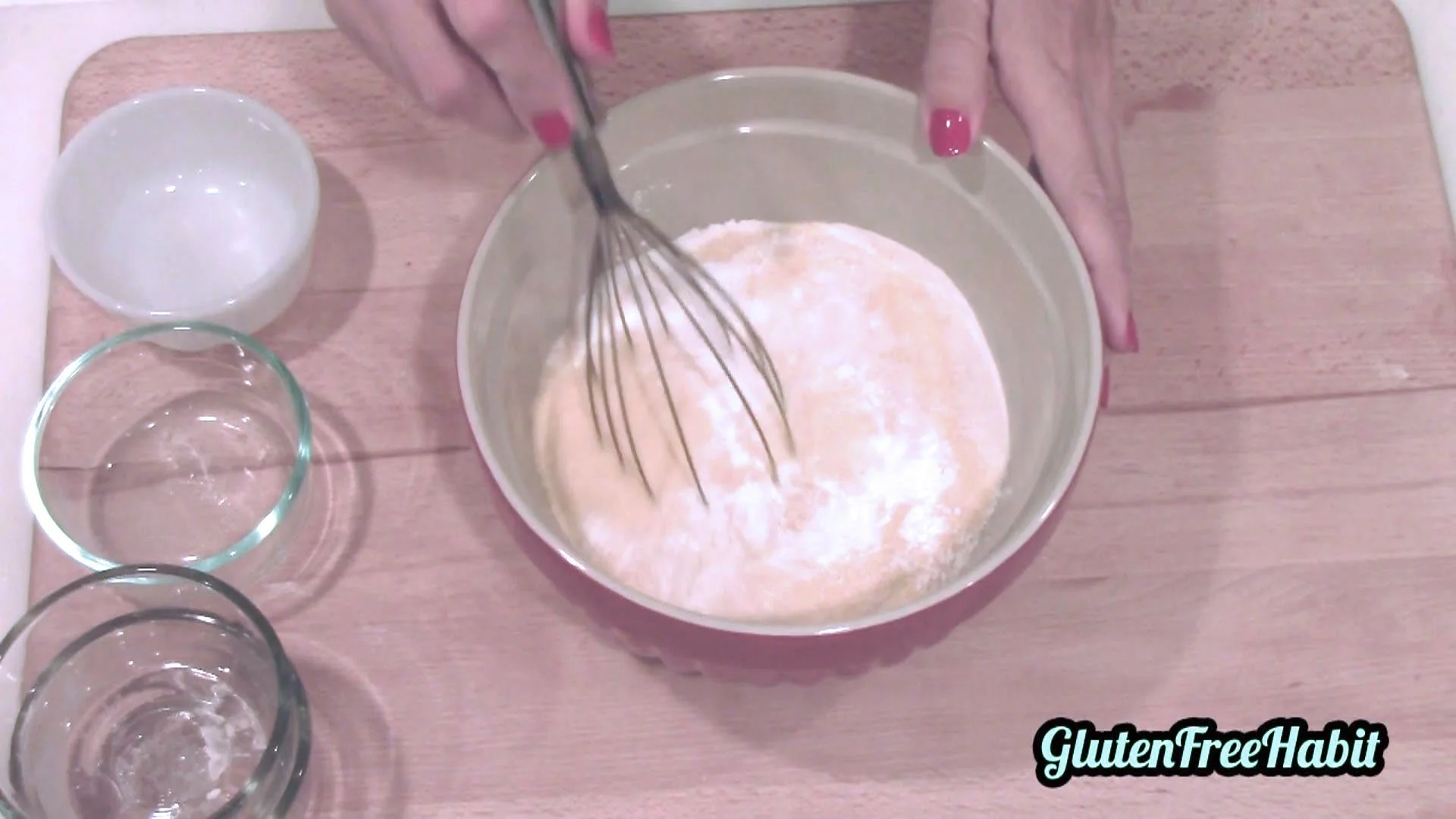 In a medium-sized mixing bowl, whisk together all dry ingredients including: gluten free flour, cornmeal, baking soda, baking powder, salt, and xanthan gum. Set aside.