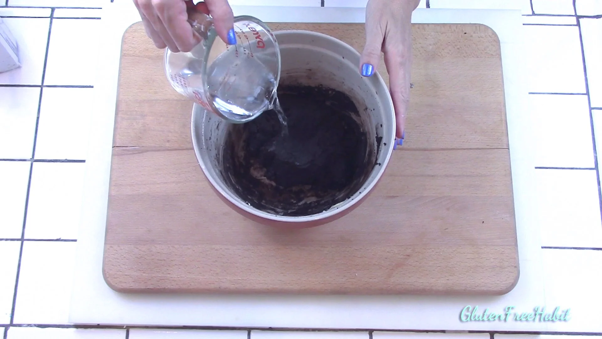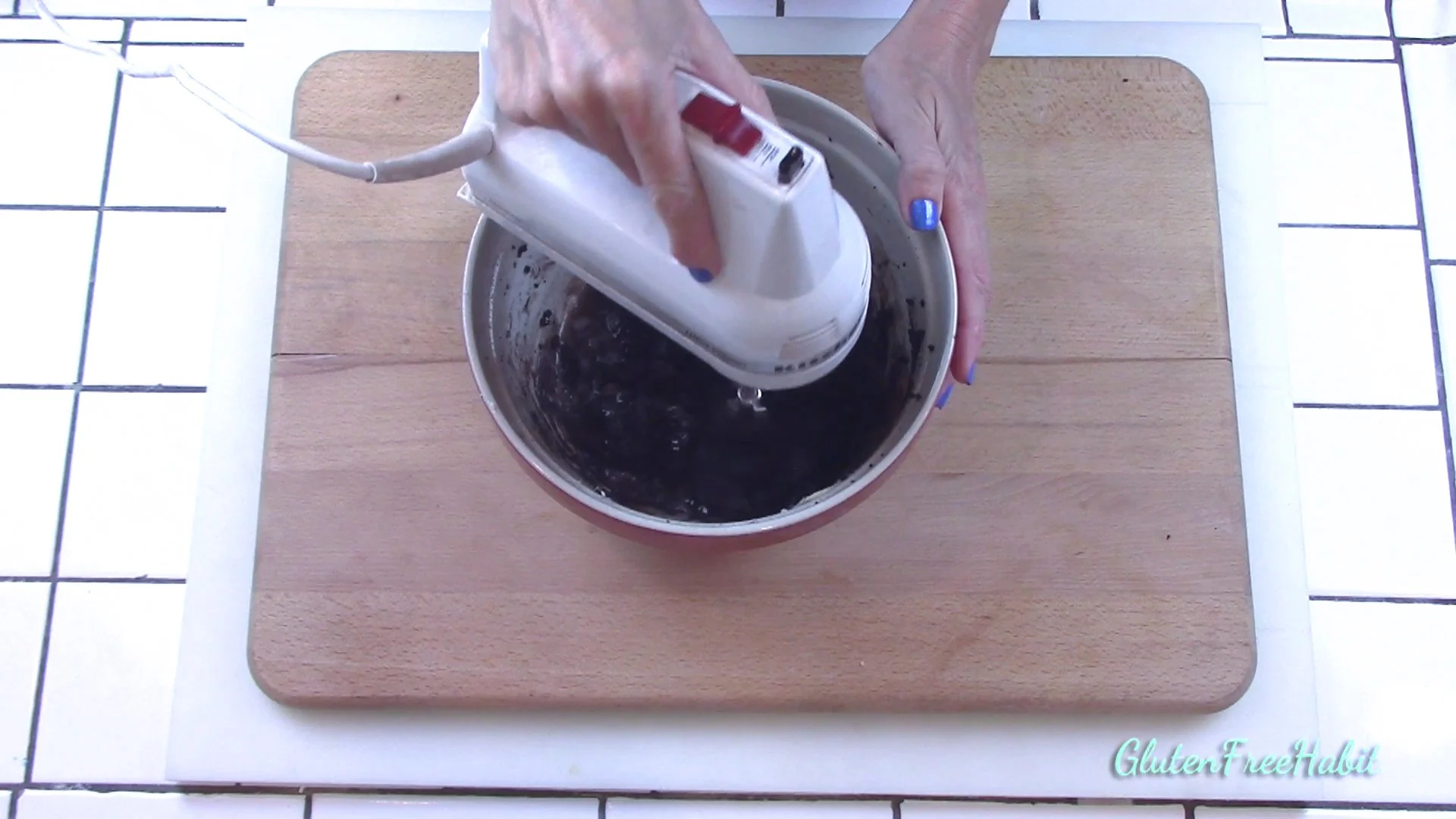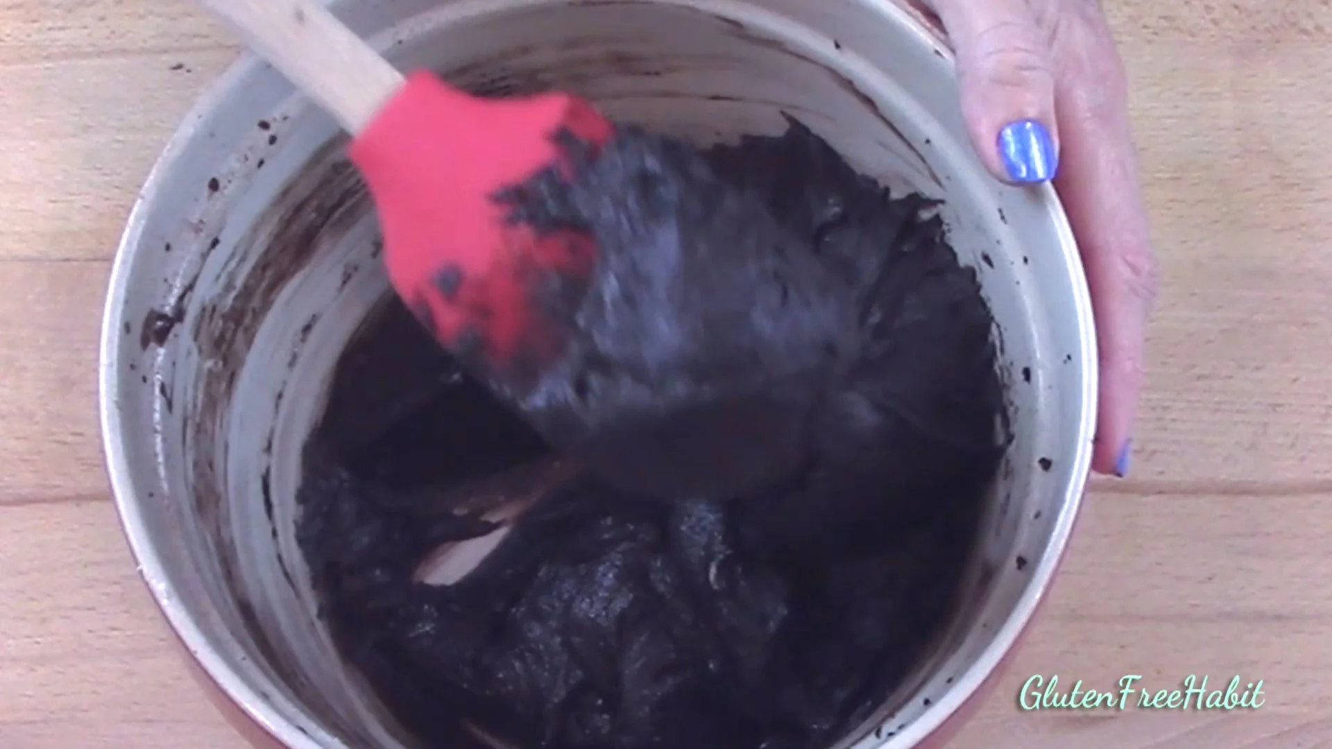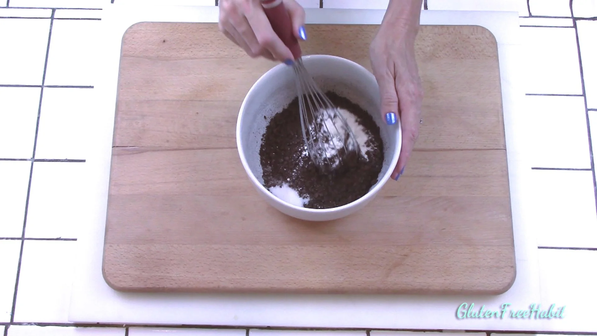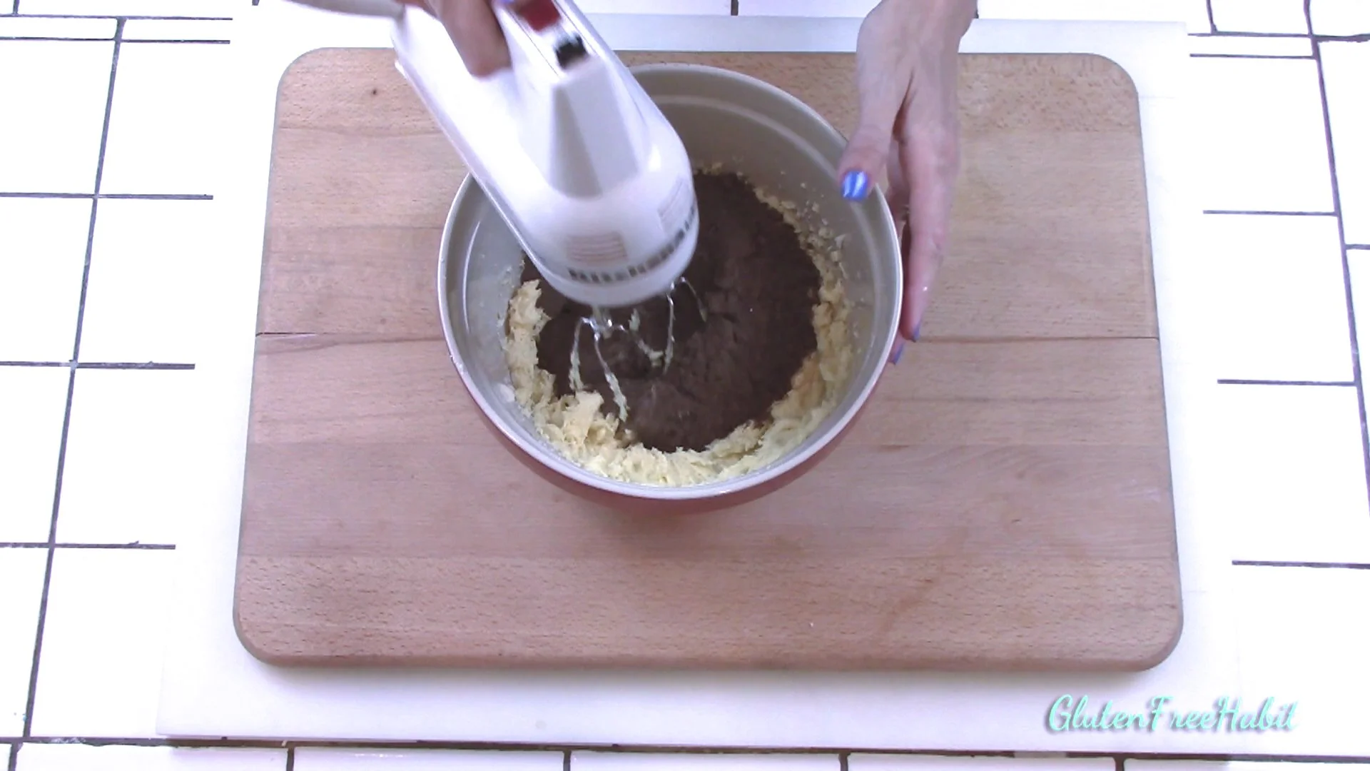 Start by mixing together your dry ingredients: In a medium-sized mixing bowl whisk together the brown rice flour, white rice flour, cocoa powder, salt, baking powder, and xanthan gum. Set aside.