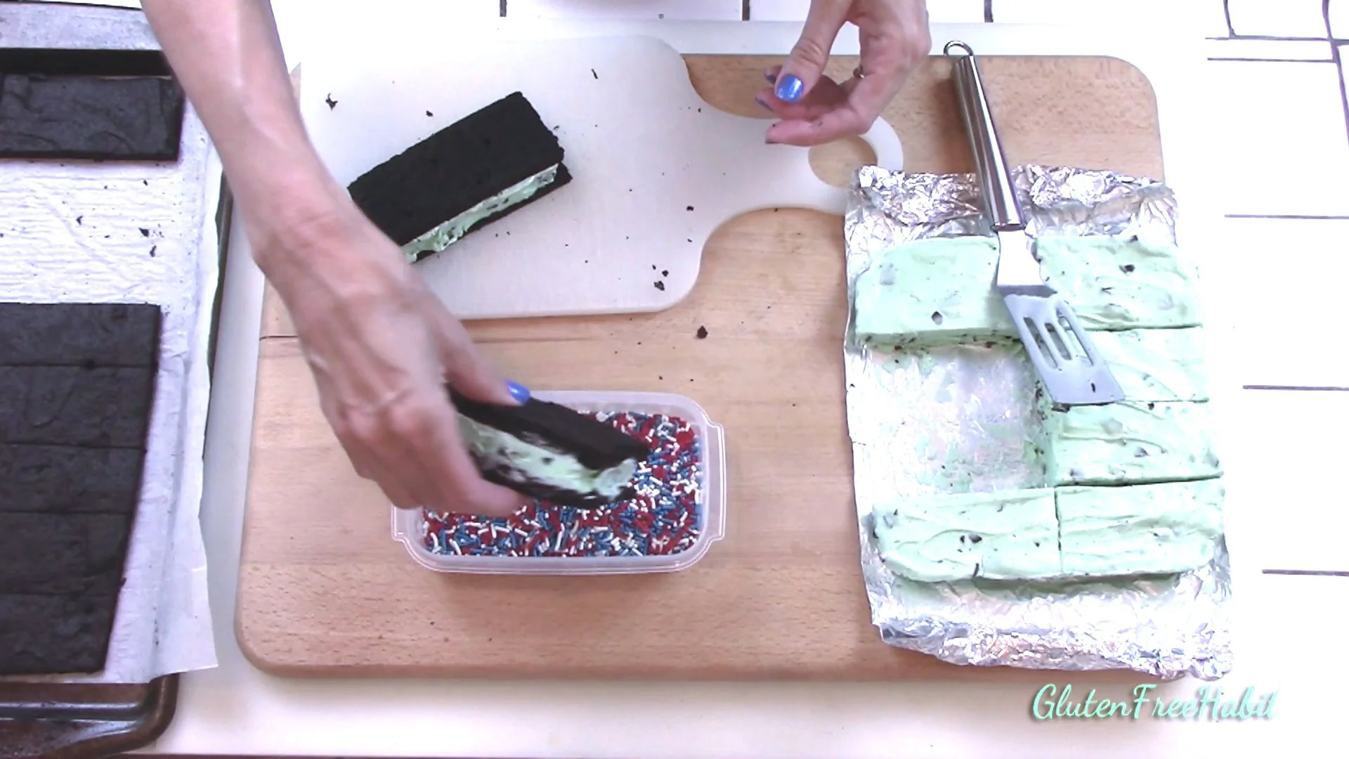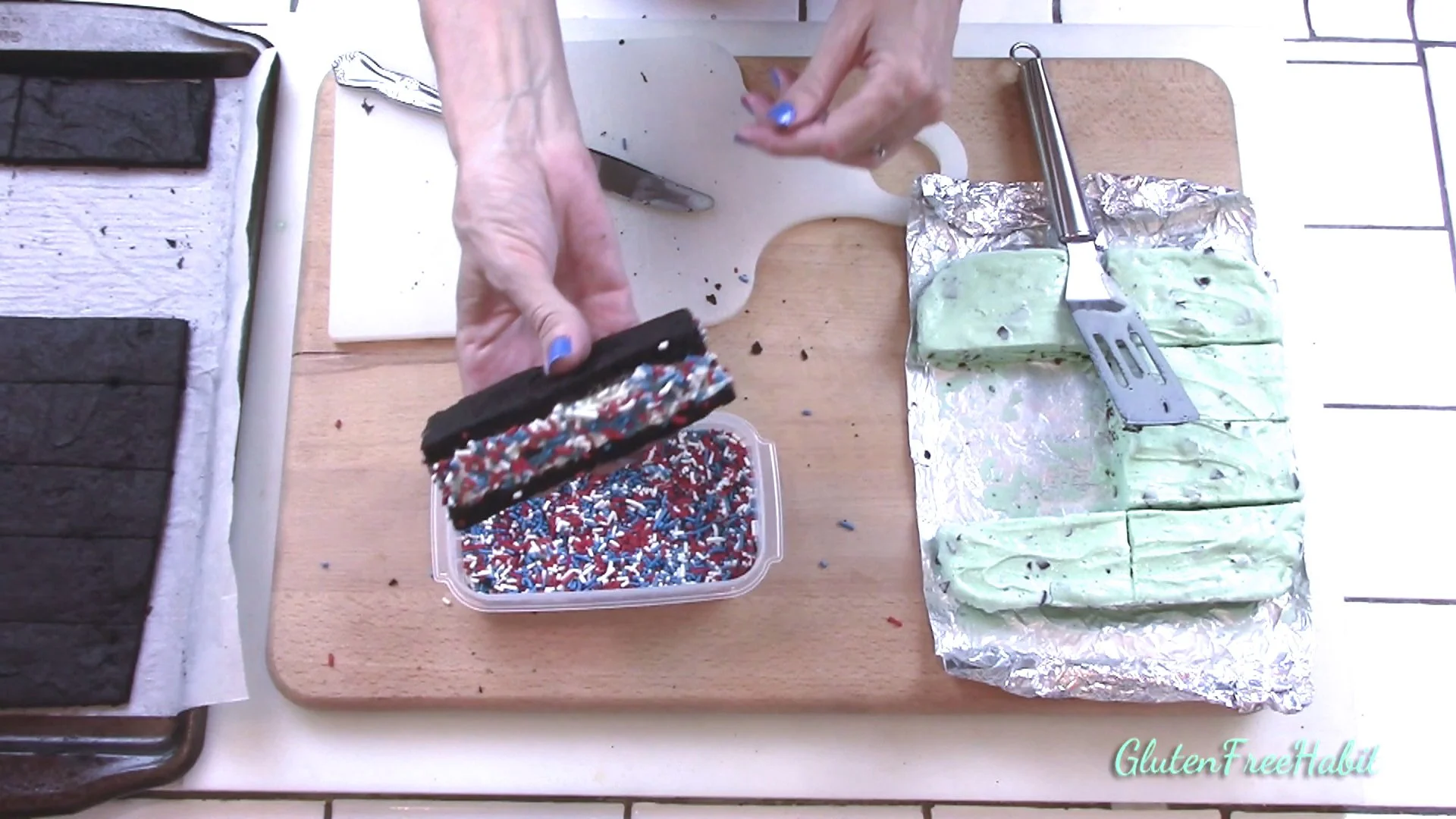 To assemble, place an ice cream piece onto a cake piece and top with a second cake piece. Gently press down on top of sandwich to spread the ice cream to the outer edge of the cake . If needed, smooth ice cream around edges with a butter knife. Press edges into sprinkles (or other topping) if desired. Place each sandwich immediately into freezer as you complete it.