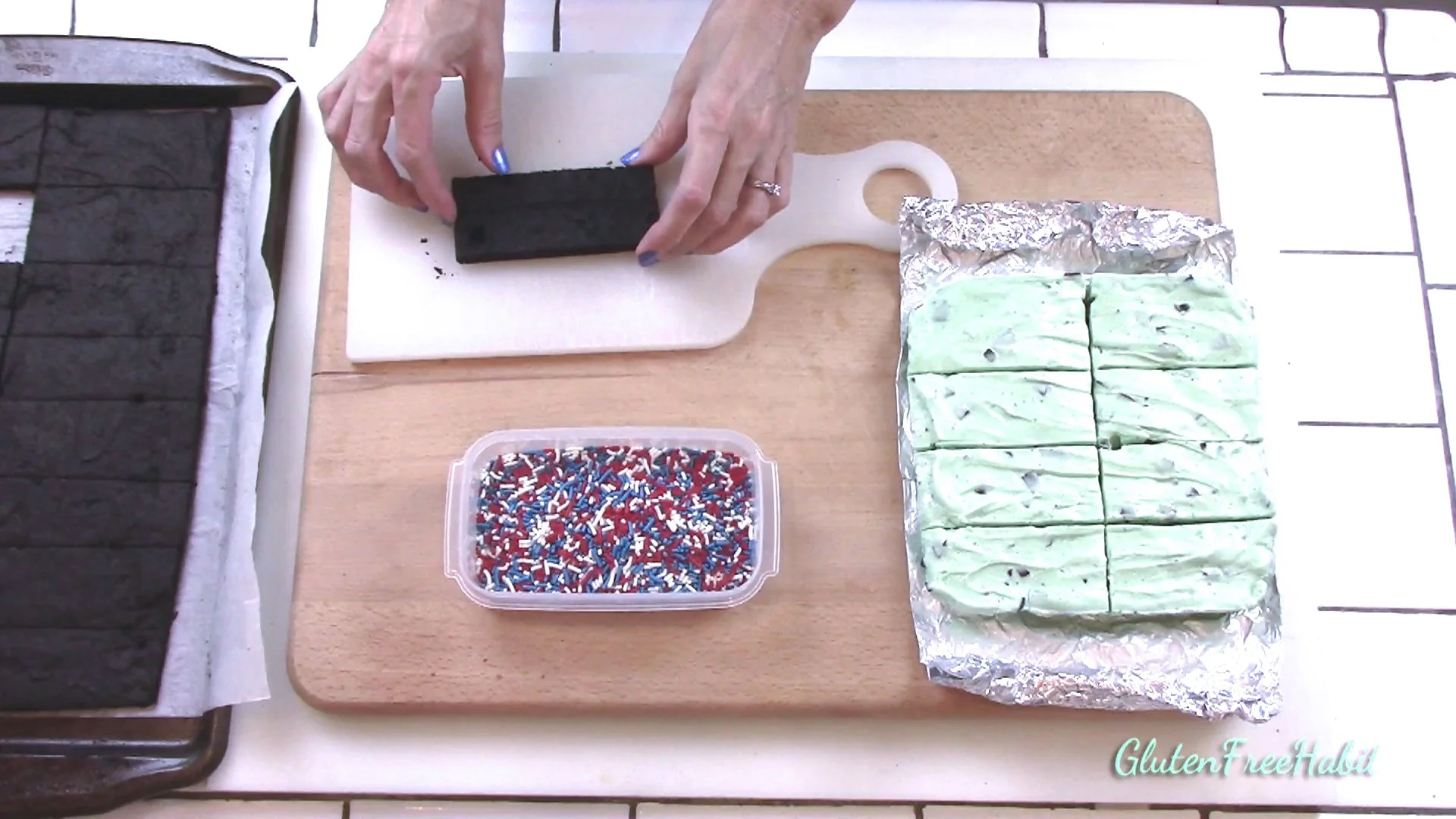 When cake is FULLY COLD THROUGHOUT you can assemble ice cream sandwiches! Remove cake from freezer. First, trim away any rough edges. Slice into sixteen 2”x4” pieces.