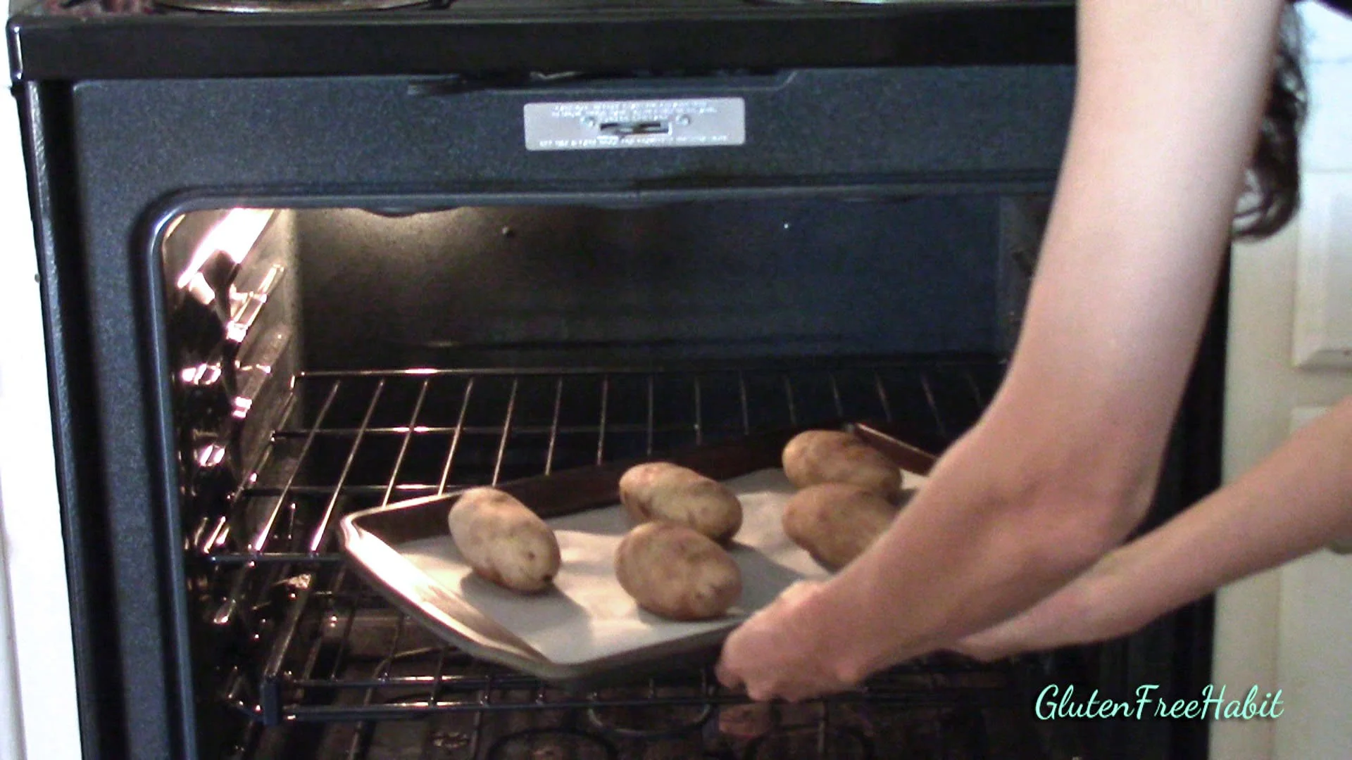 Place potatoes on baking sheet and bake for about 50 minutes or until you can insert a fork easily. Baking time will vary because of different size potatoes.