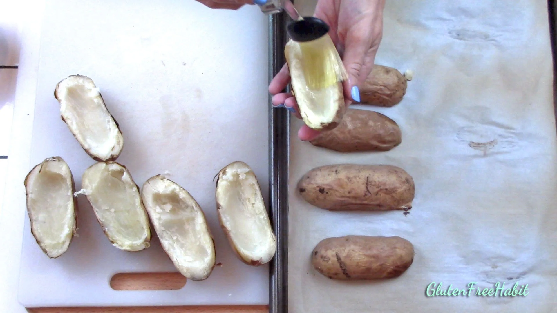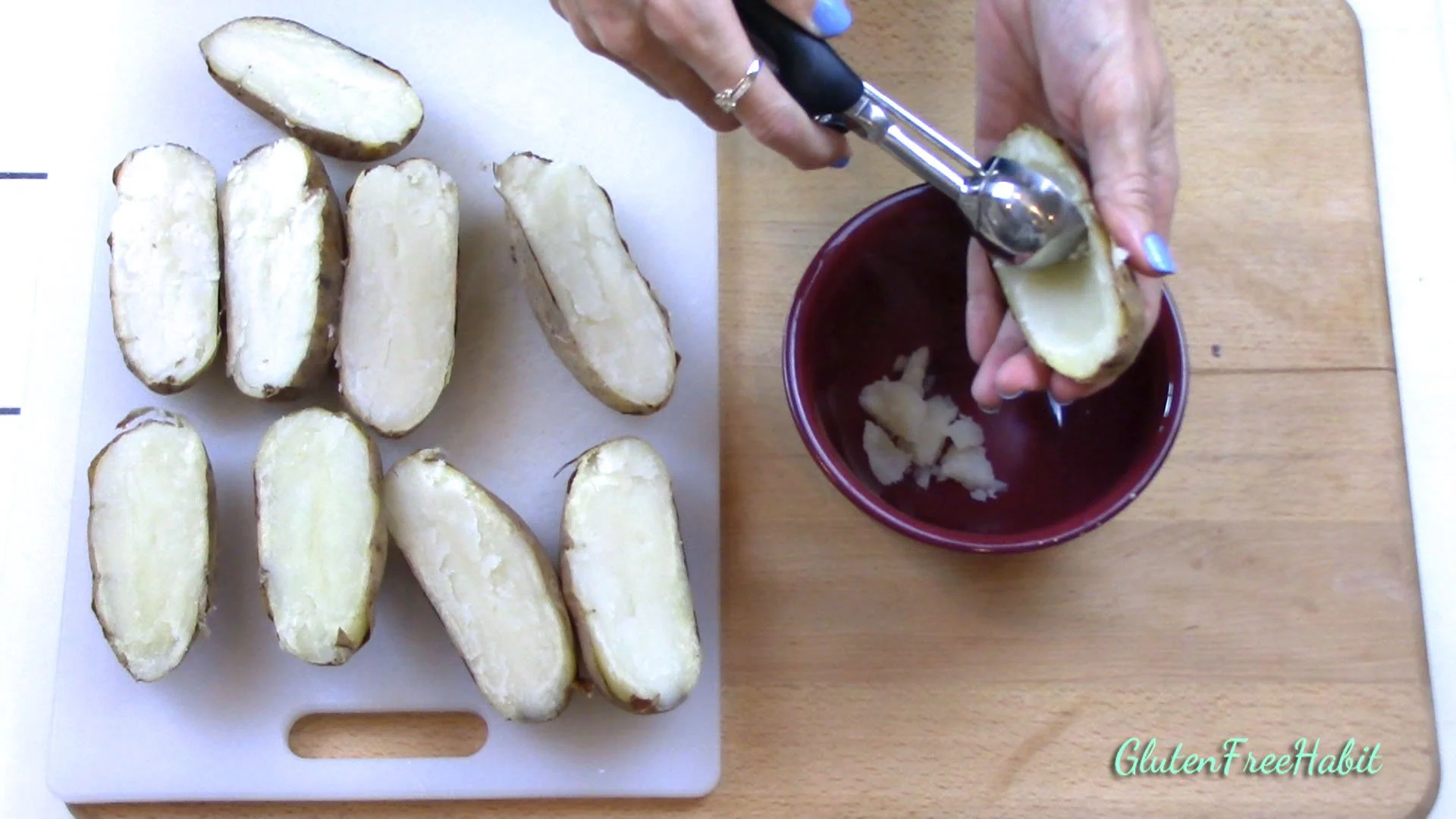 Slice each potato lengthwise, and with melon baller or spoon, scoop out about ½ of the flesh to create a nice place to put the toppings. Save the excess potato in a bowl for another use. If potatoes are still too hot to handle, use a clean kitchen towel to hold underneath.