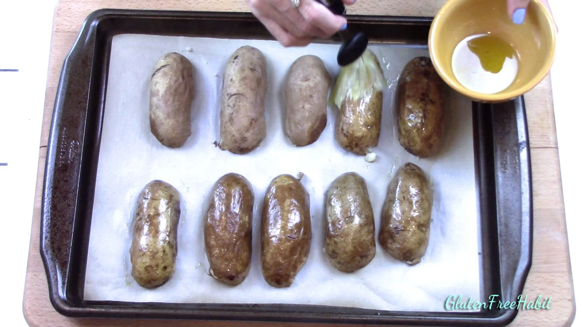 Now brush the outside of each potato with olive oil.