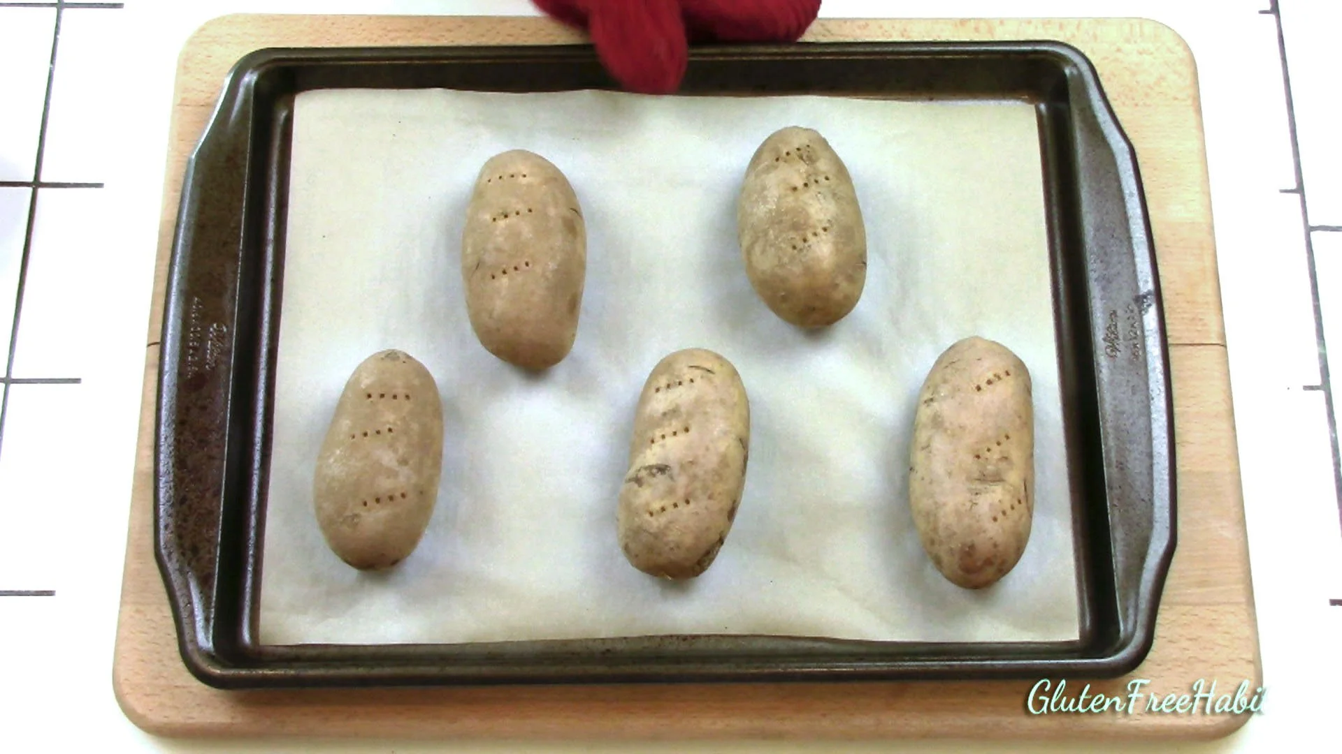 Line a baking sheet with parchment paper for easy clean-up, and scrub the potatoes clean.