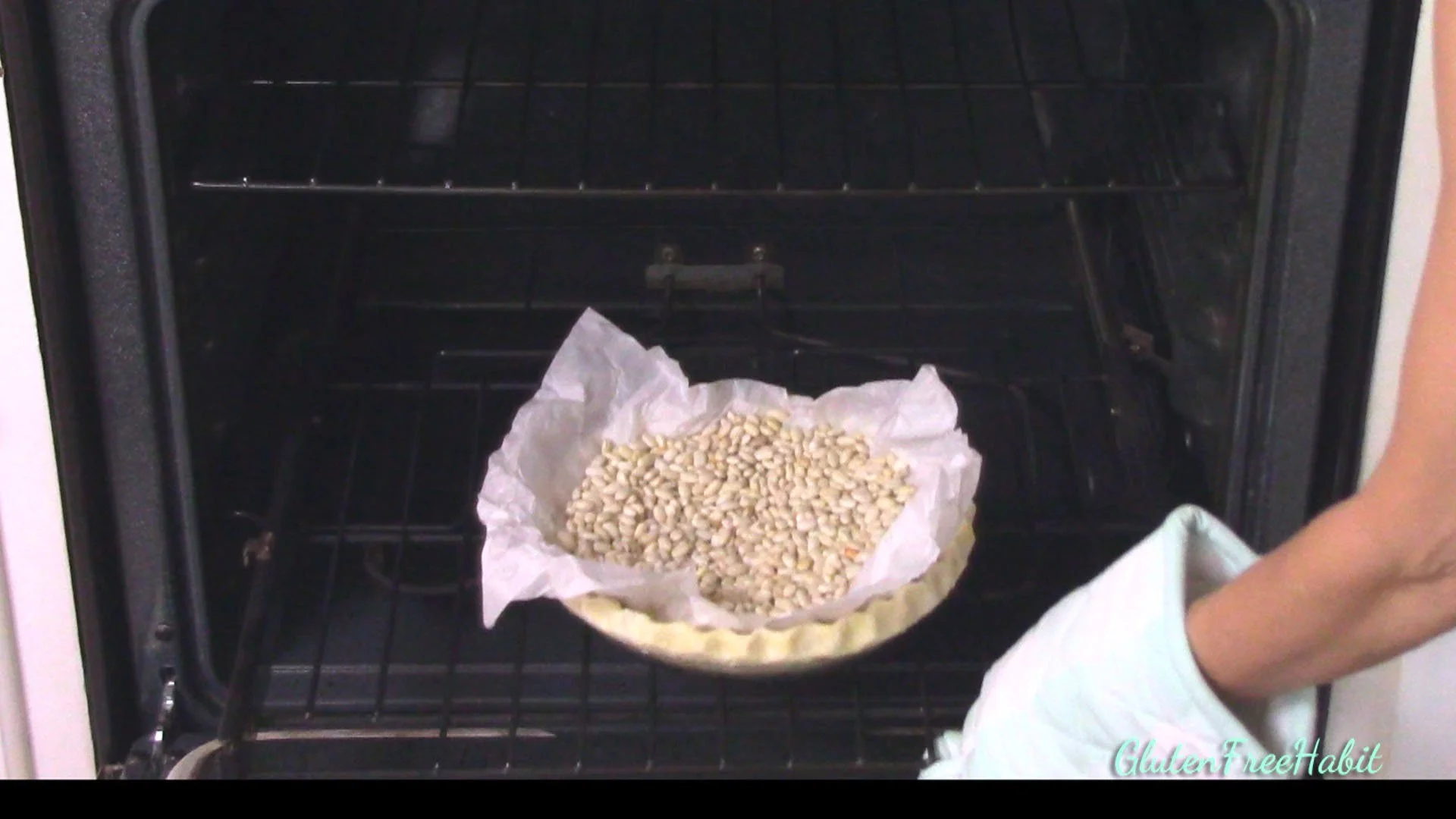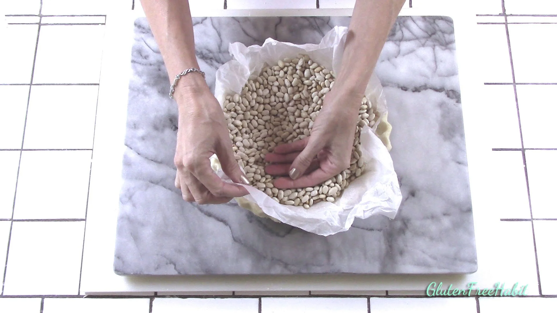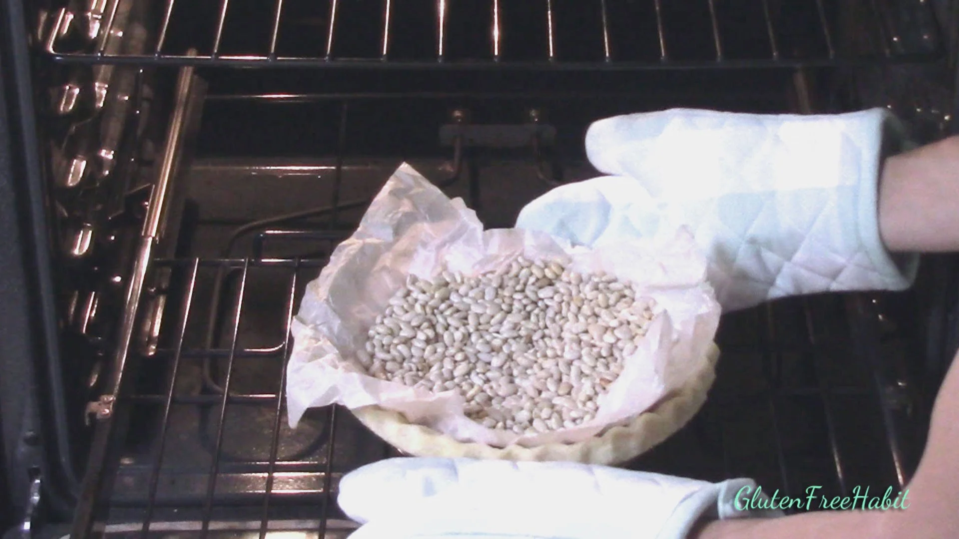 Fill with beans, rice, or pie weights, all the way up to the top edge of pie shell, gently pushing beans against the side walls of the dough.