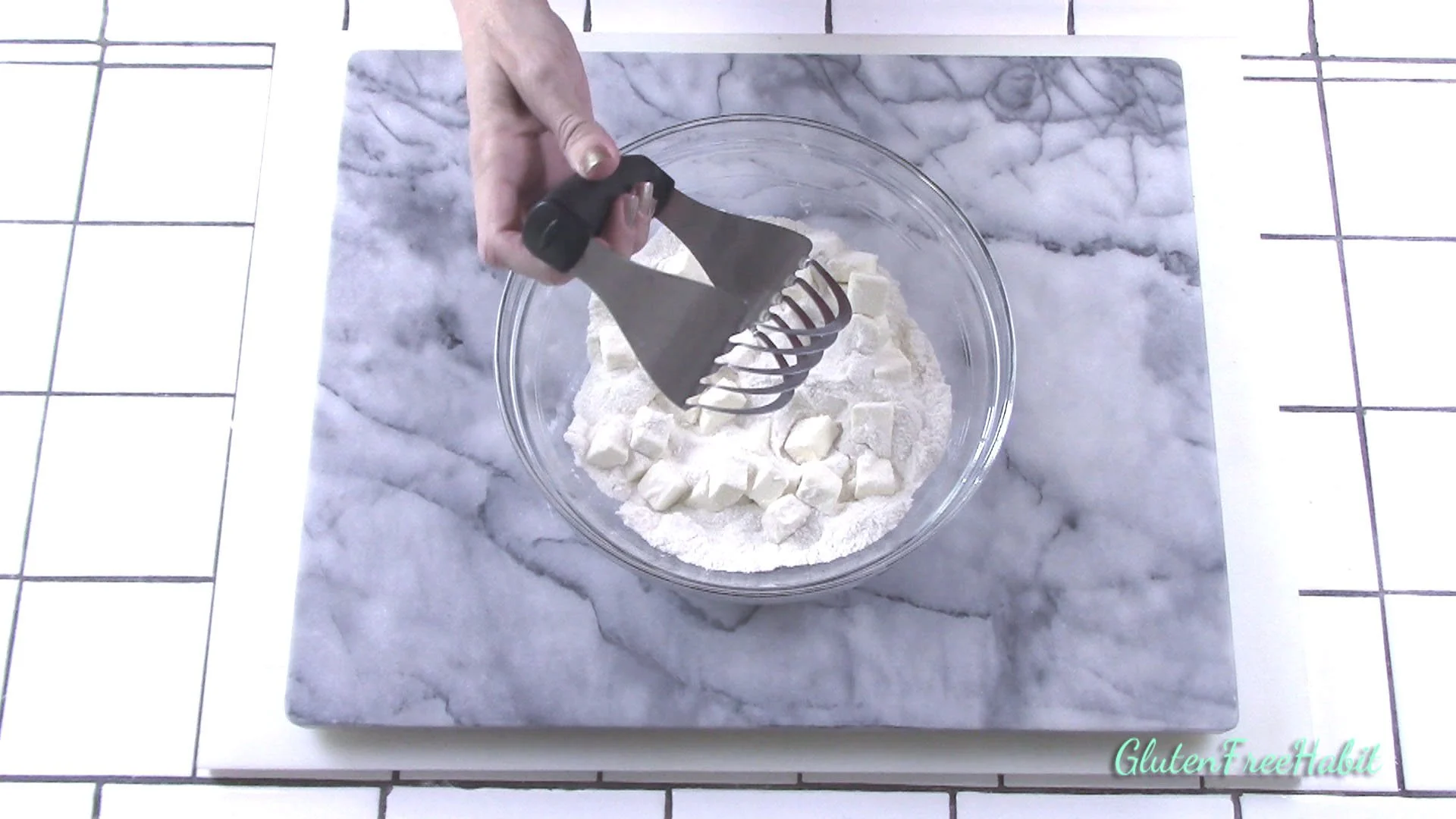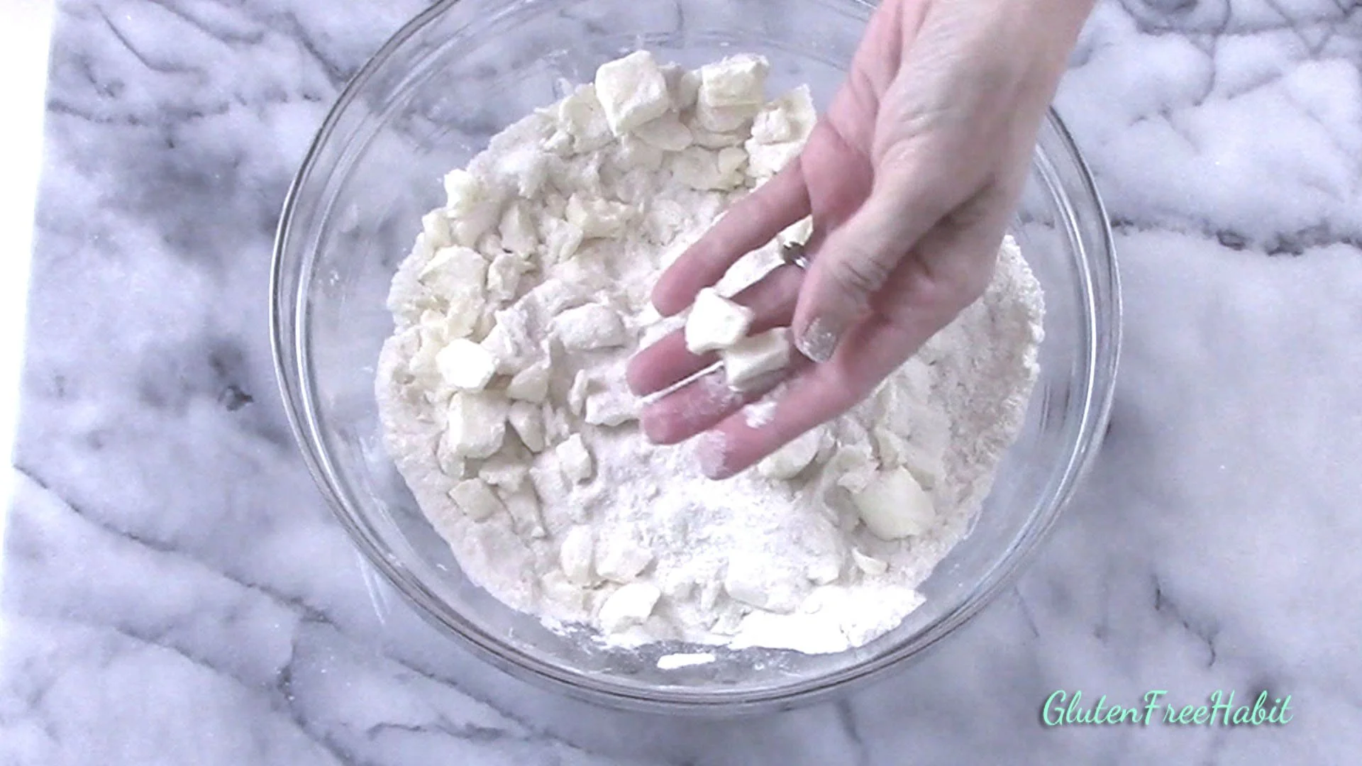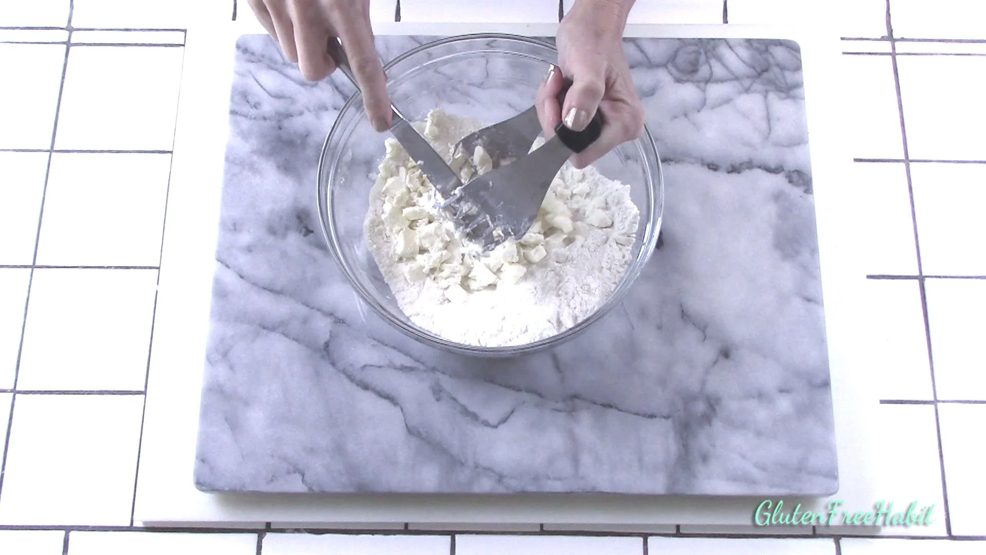 Using pastry cutter, cut in the butter until it is evenly distributed, and pieces are pea-sized.