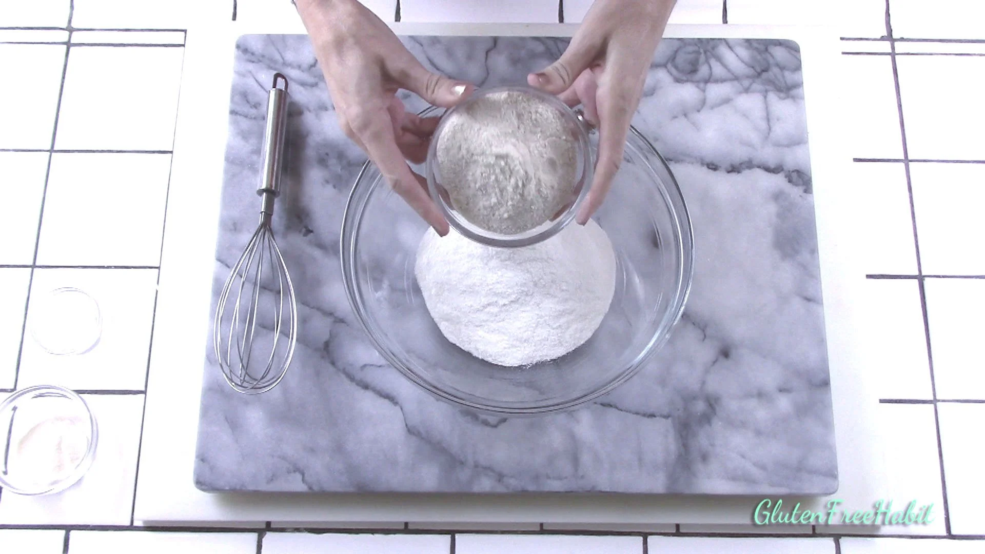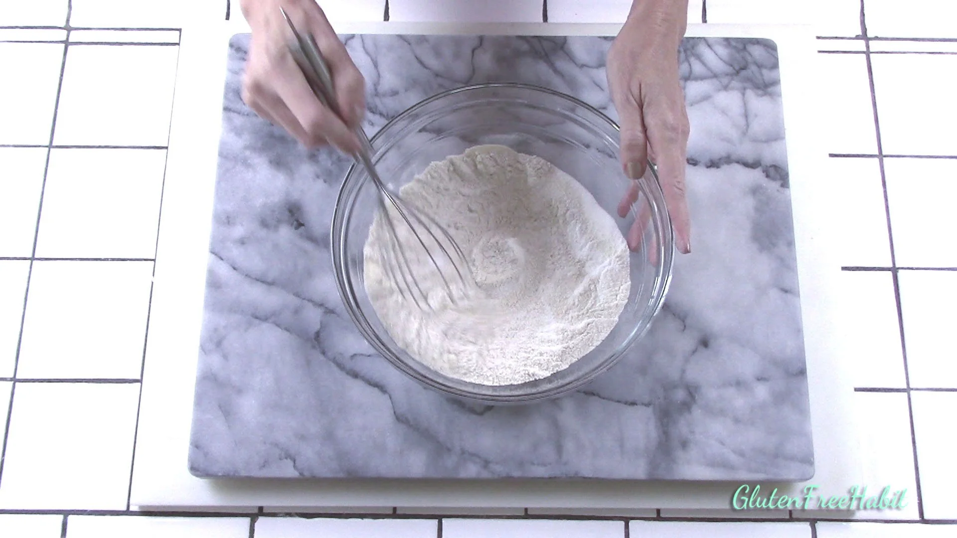 To a large mixing bowl, add white rice flour, brown rice flour, salt, xanthan gum, and sugar. Whisk well.