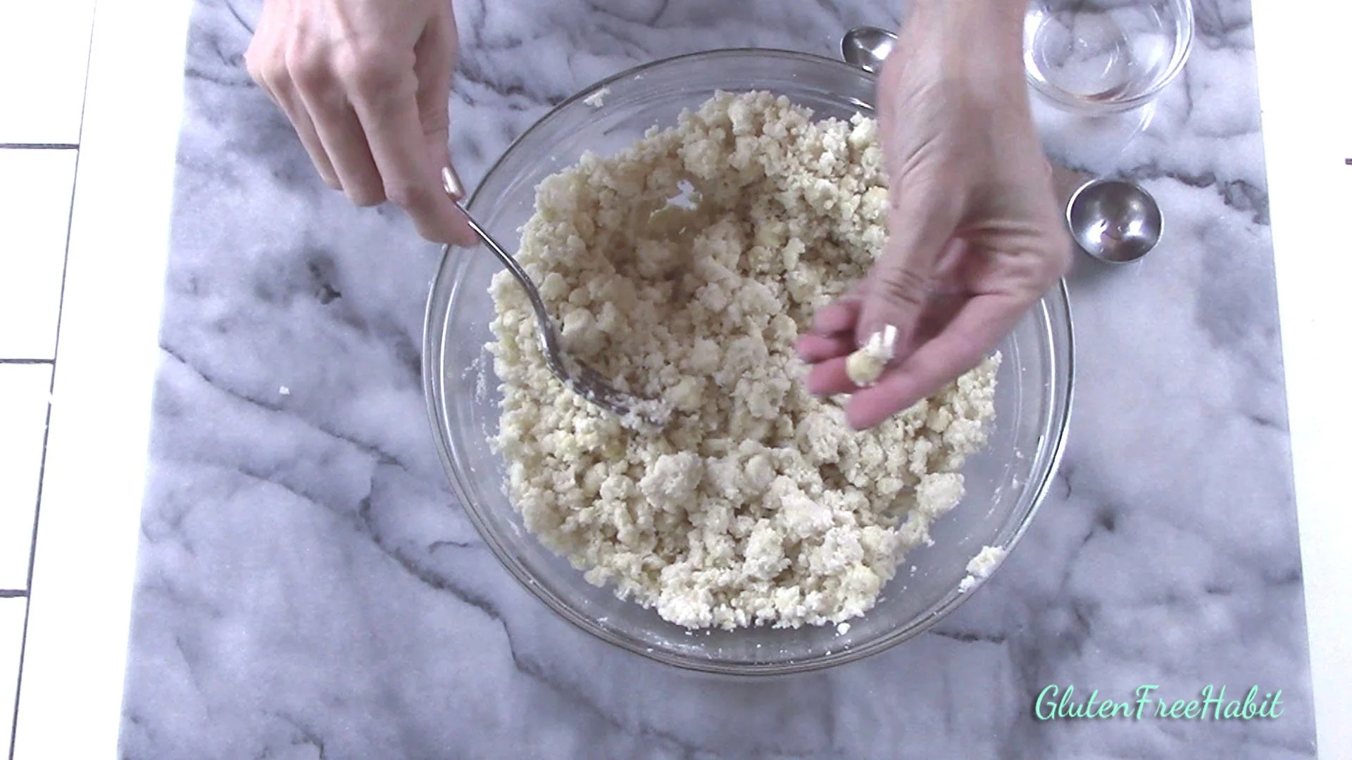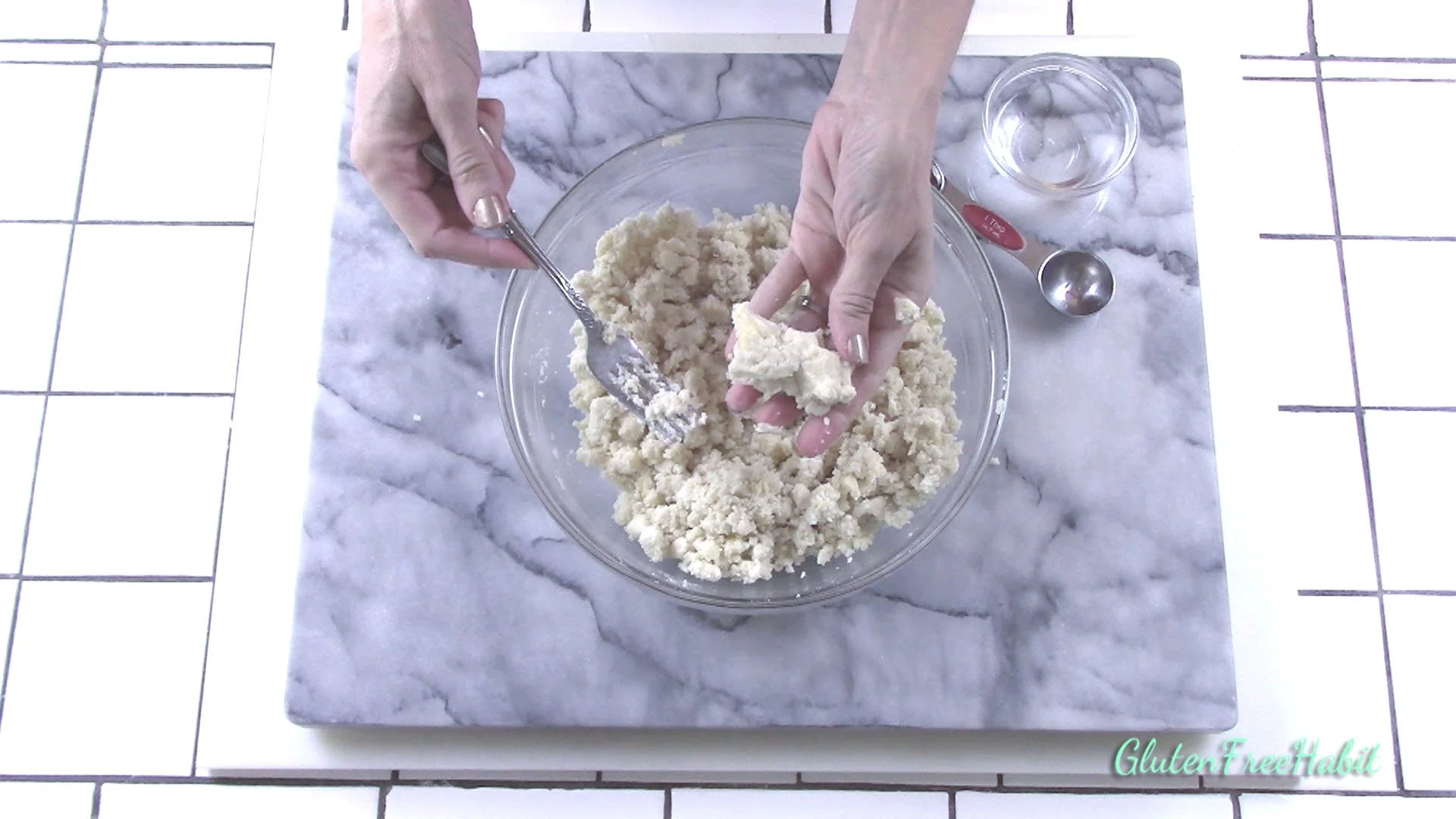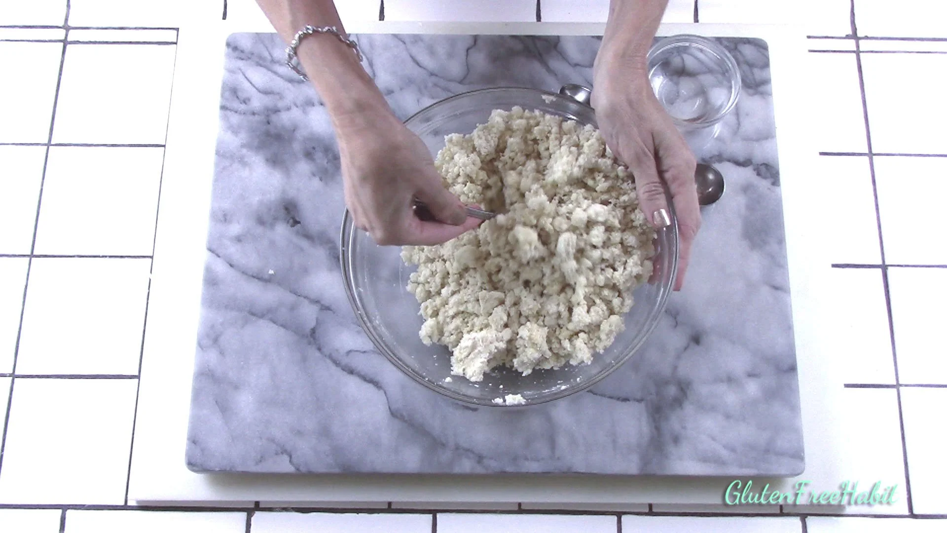 Continue adding water, one tablespoon at a time, just until all dry crumbs are very lightly moistened. I find that 4 tablespoons is perfect for my dough. Dough will be somewhat moister than typical “gluten” dough, but should never be so moist that it gets sticky.