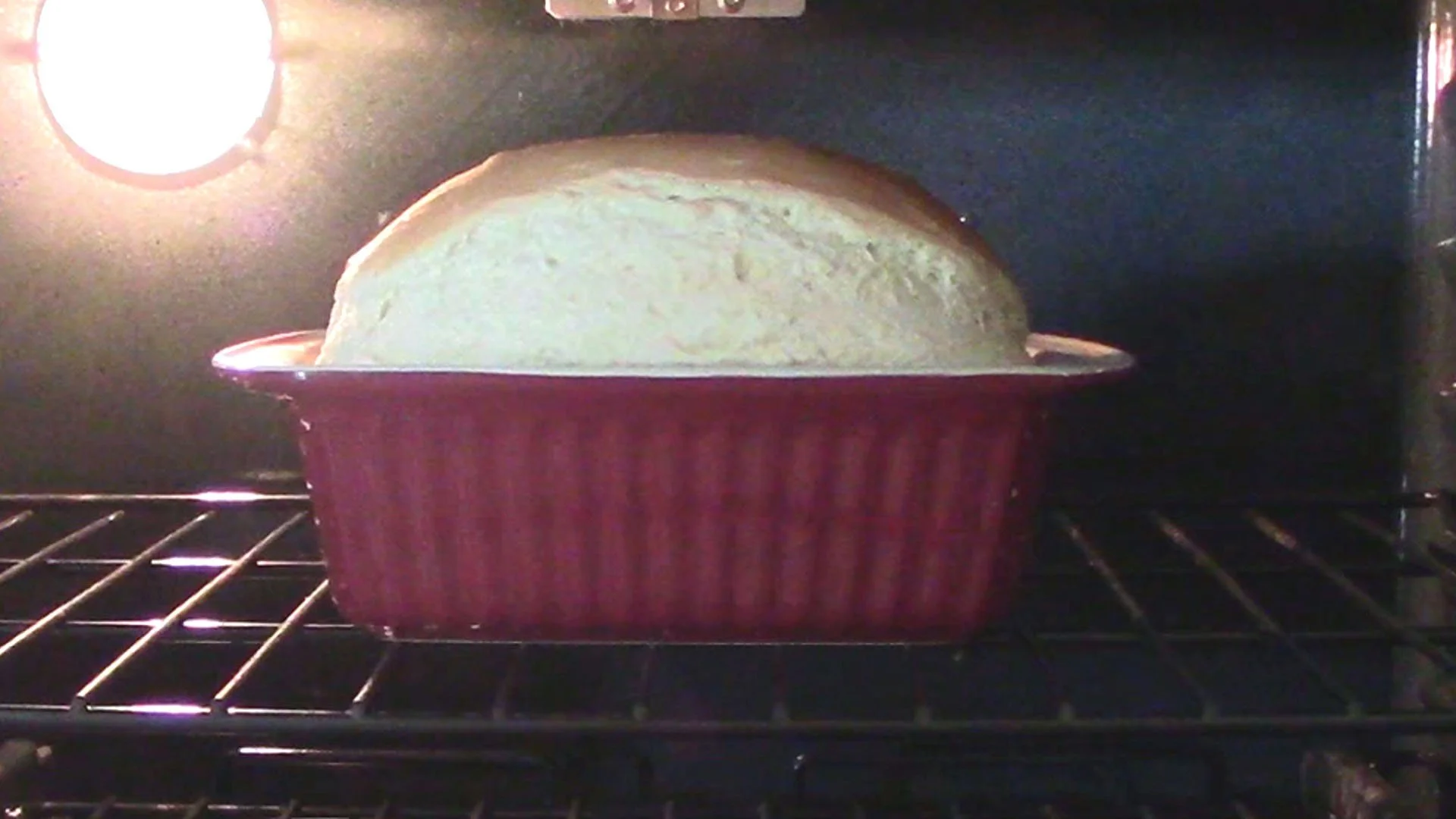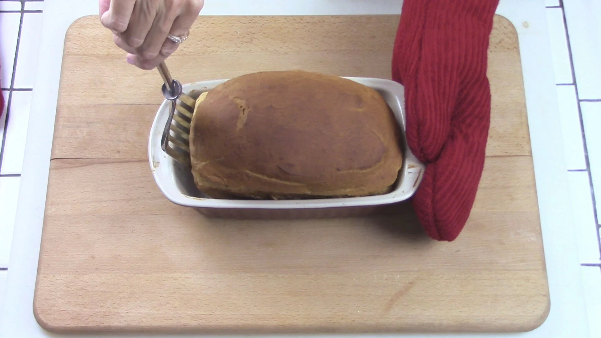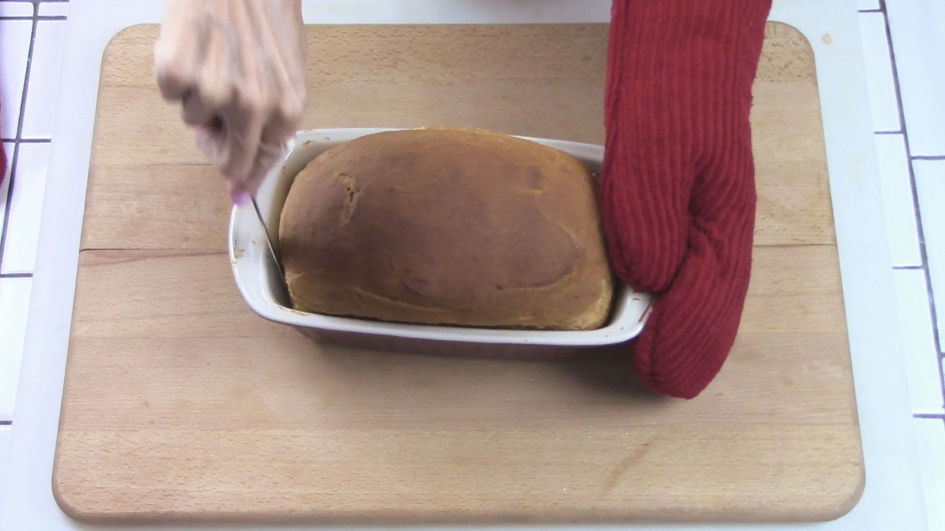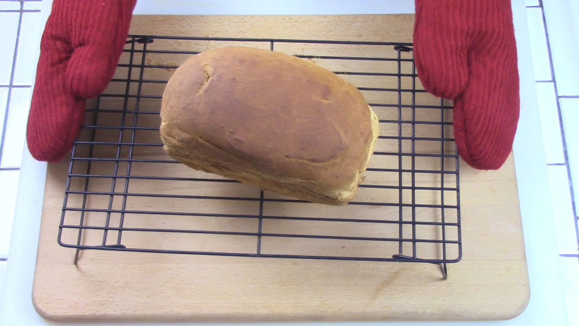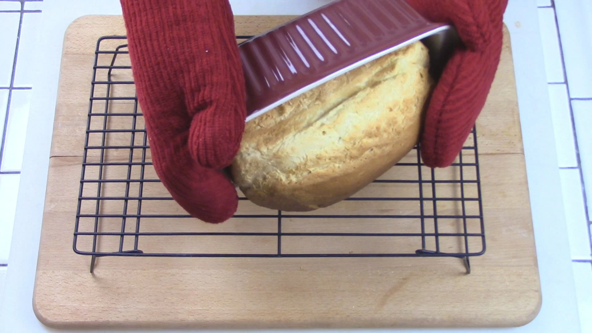 Let cool COMPLETELY on wire rack before cutting. This will usually be at least 3 hours. It is normal for bread to sink slightly when cooling. To help keep top rounded you can cool bread on its side, rotating once in a while between sides and upright position.