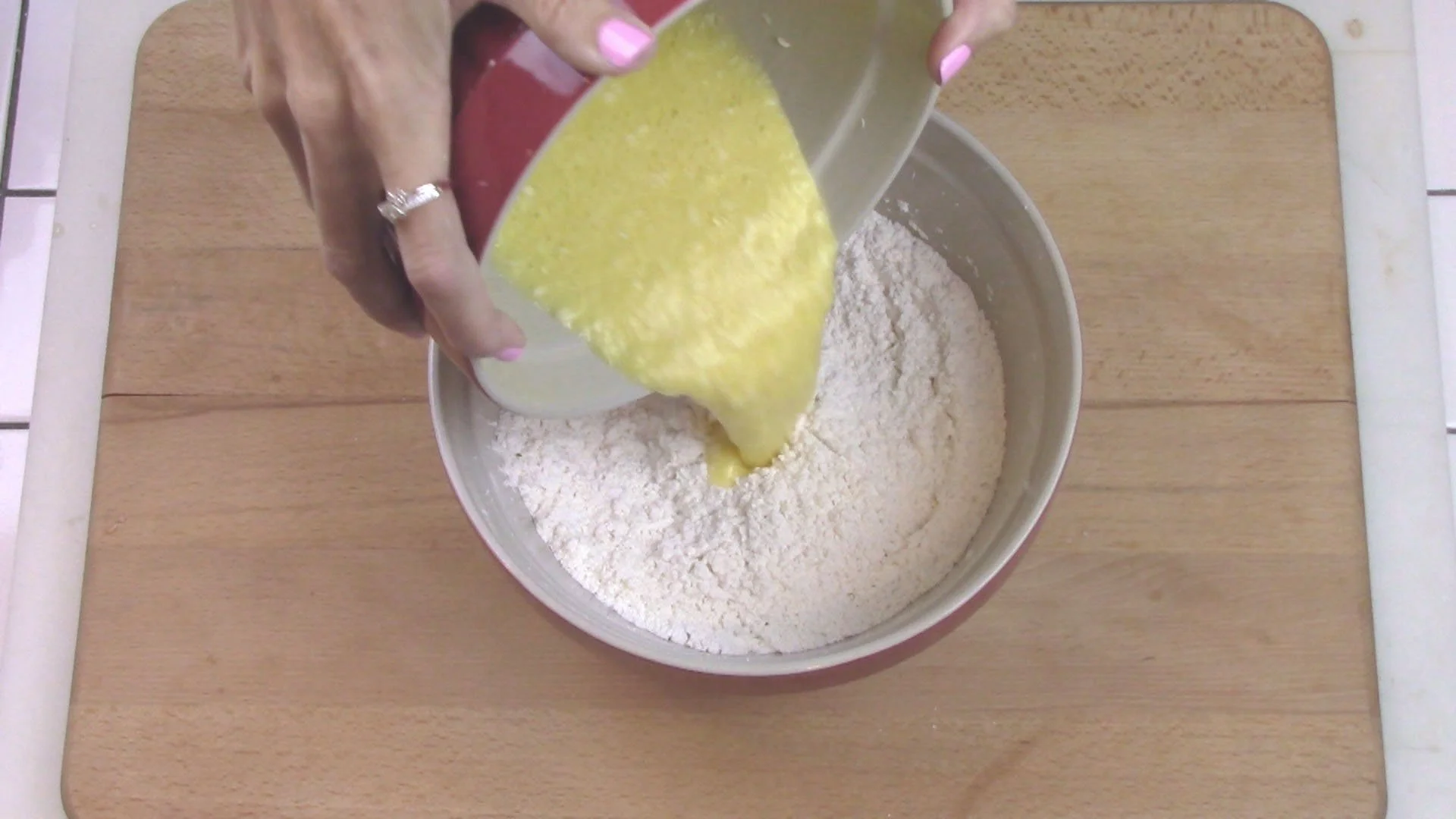 While you are waiting for yeast to proof, in a medium mixing bowl, mix together your wet ingredients (eggs, apple cider vinegar, and butter).