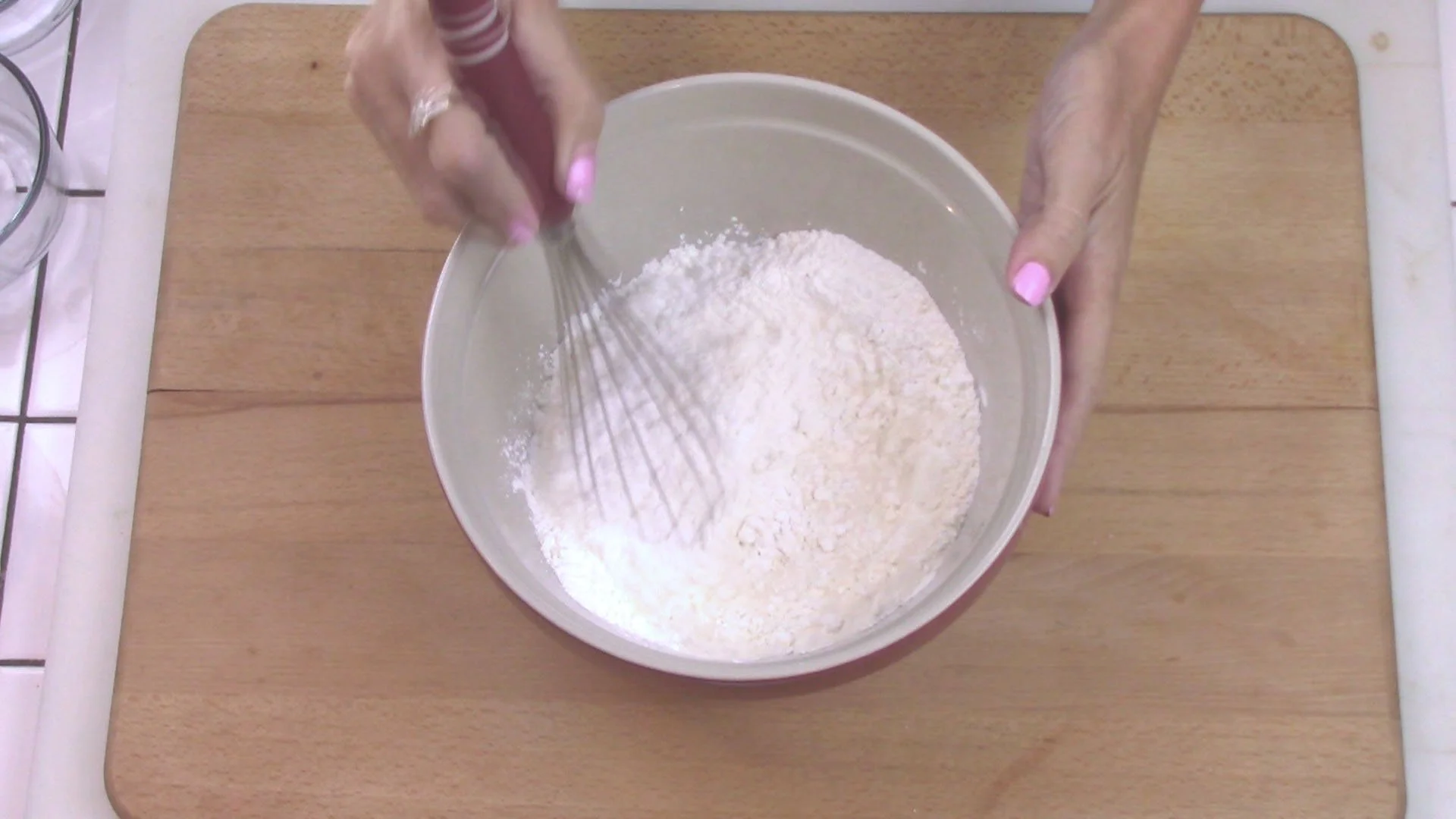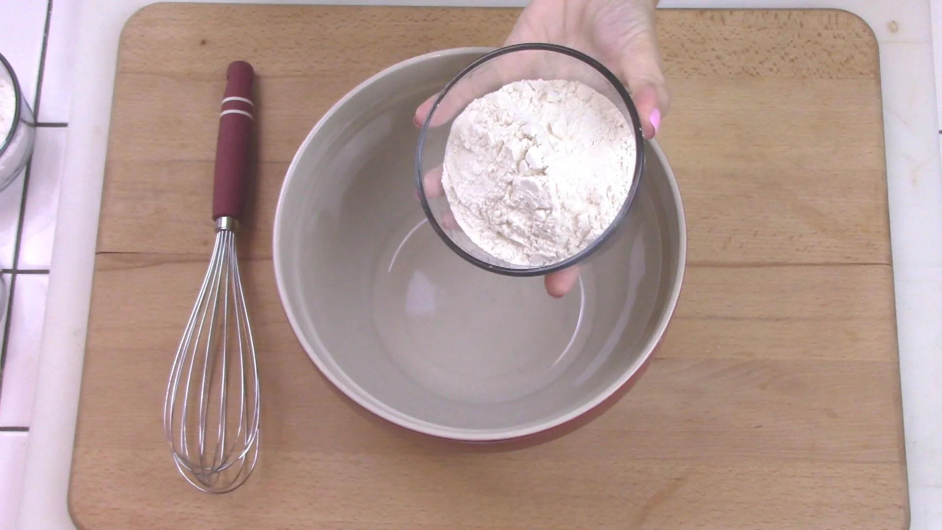 In large mixing bowl, whisk together dry ingredients (brown rice flour, corn starch, tapioca flour, xanthan gum, salt, and baking powder). Set aside.