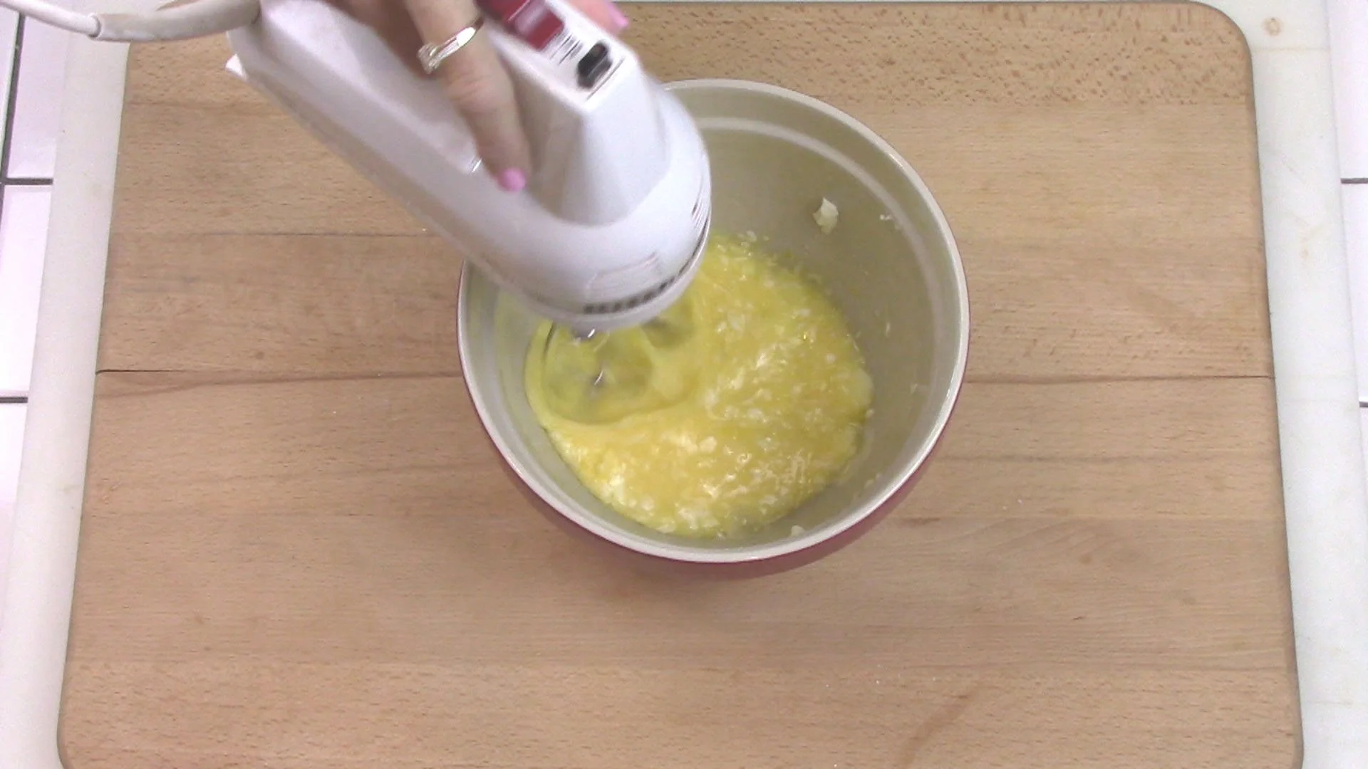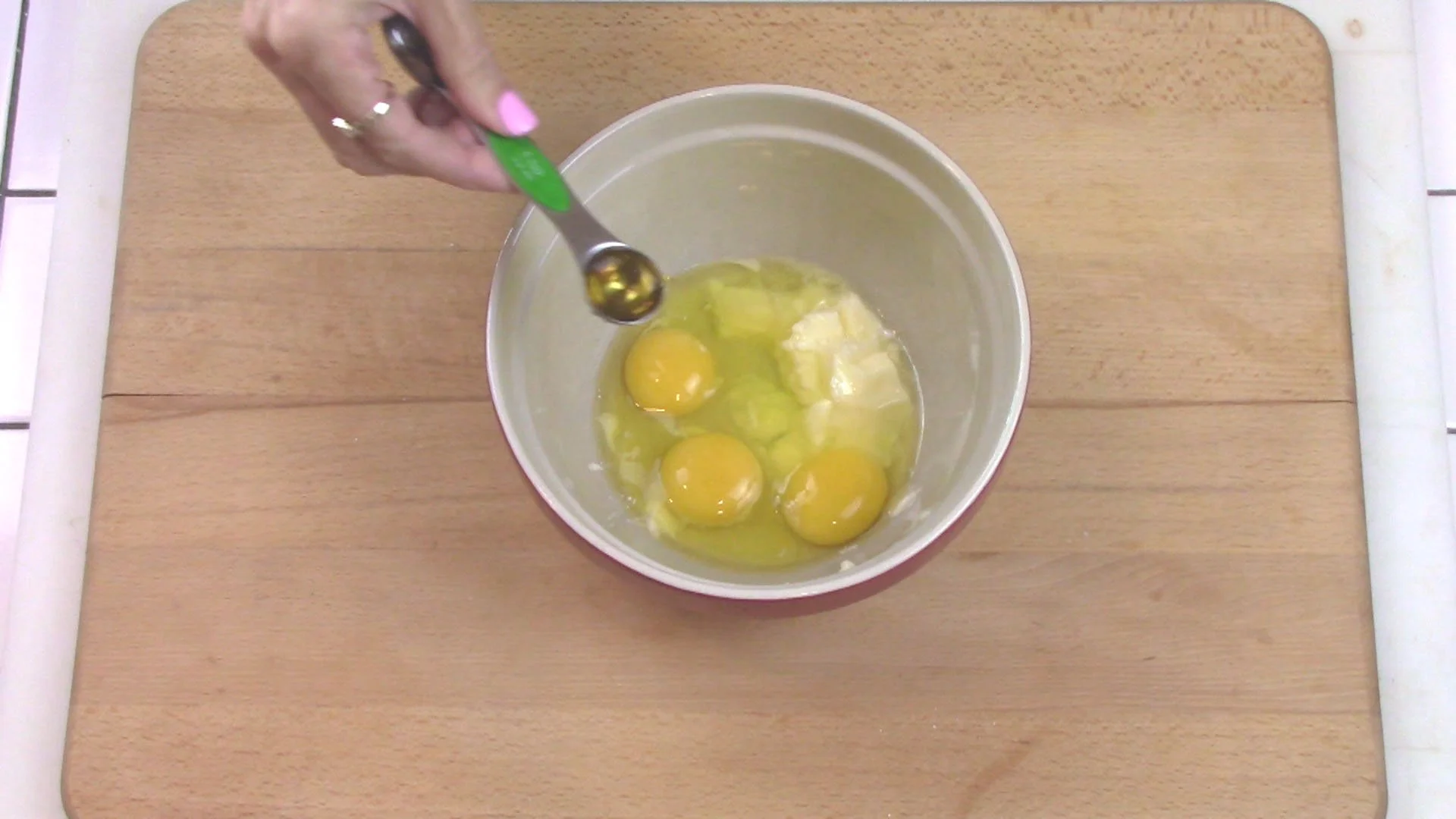 While yeast is proofing, in a medium mixing bowl, combine wet ingredients: butter, eggs, and apple cider vinegar.