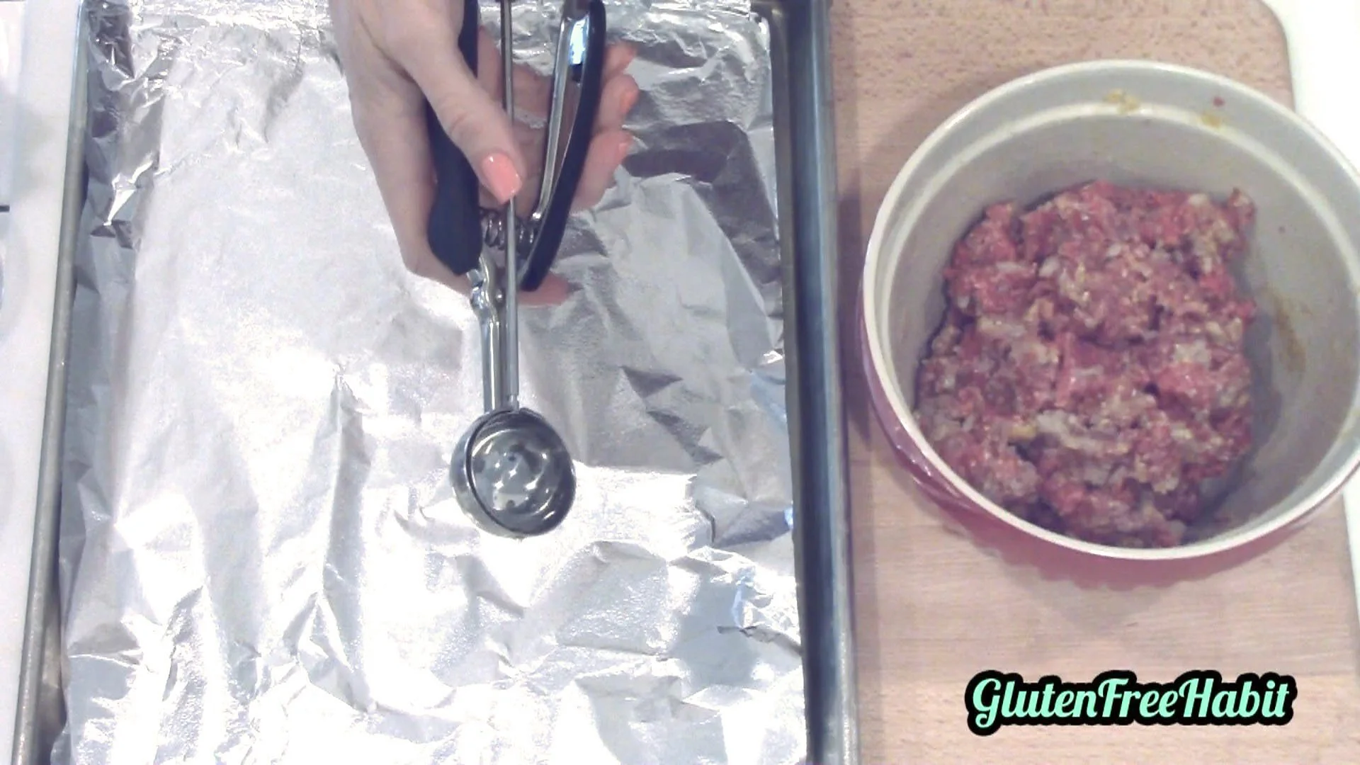Get out a small scooper, and set out lined pan and meatball mixture.