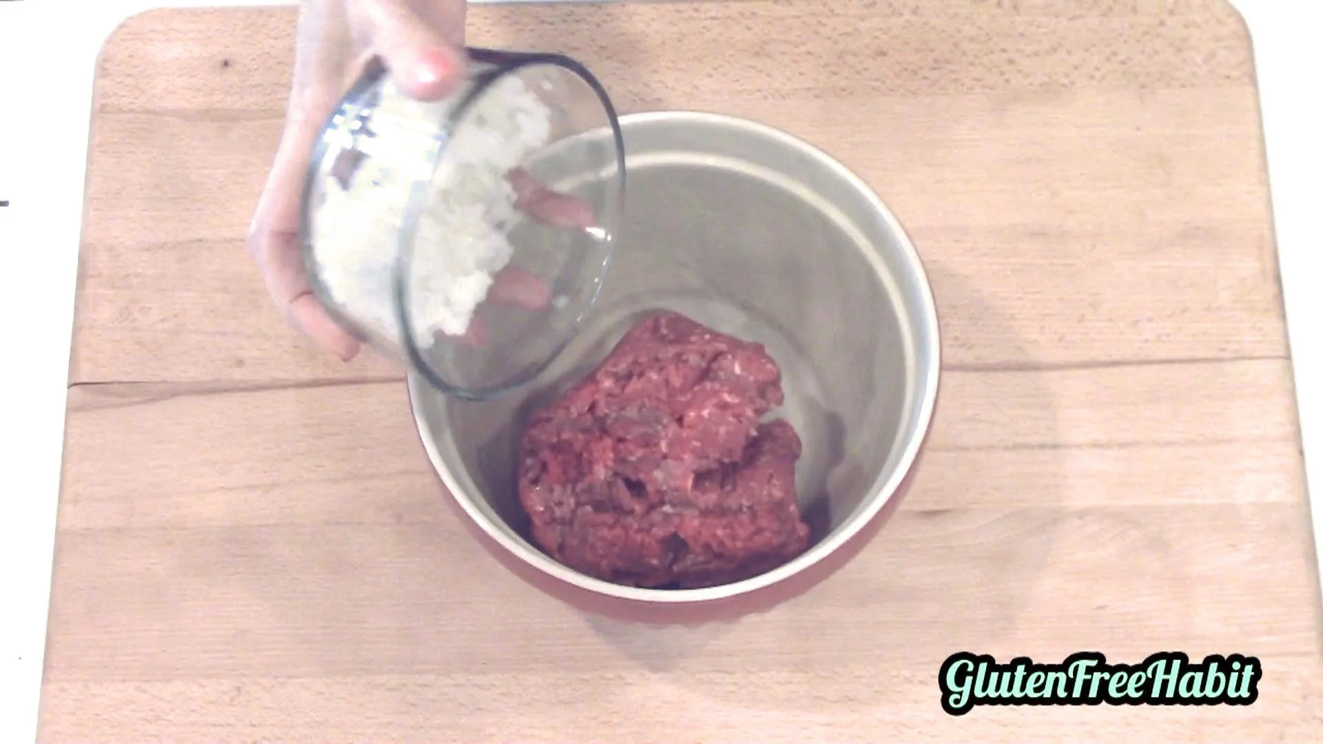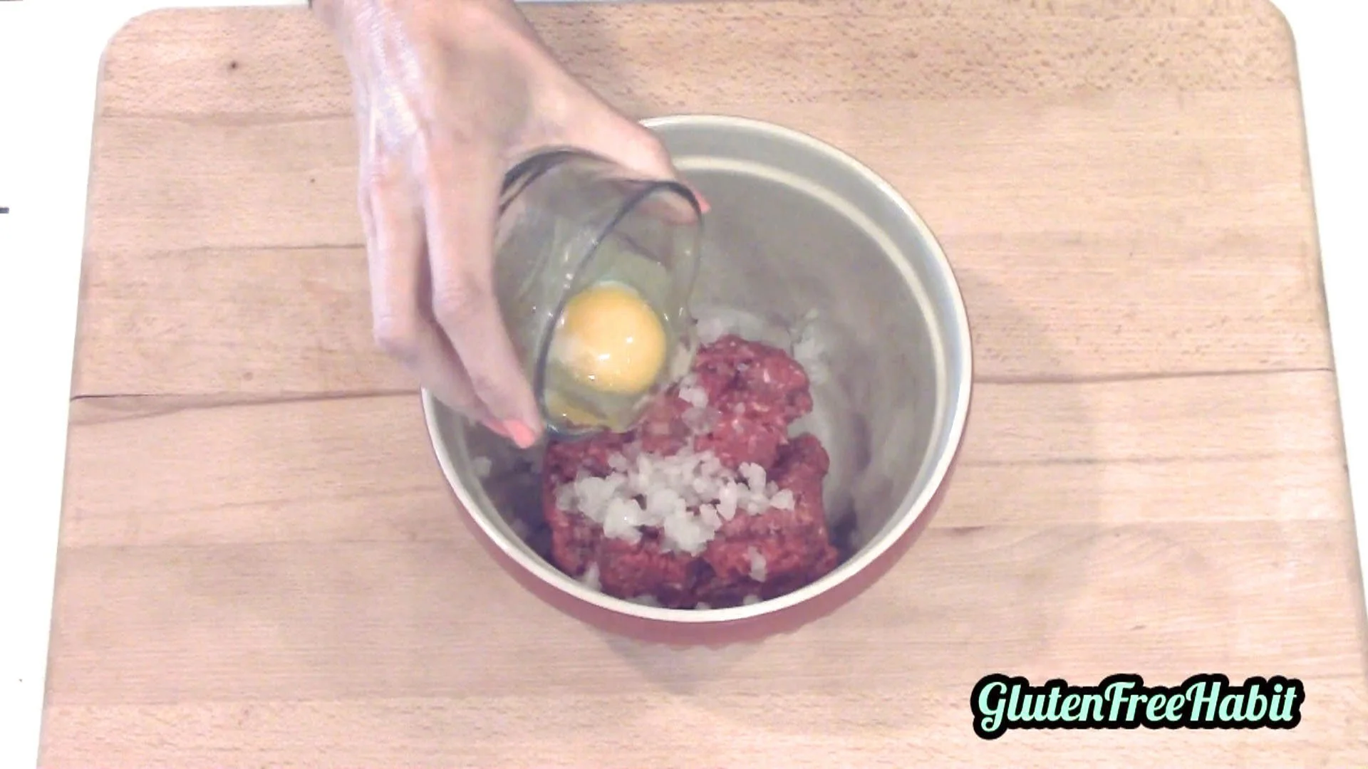In medium bowl combine ground beef, onion, egg, water, and bread crumb mix.