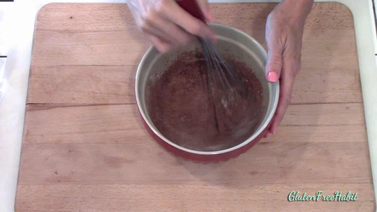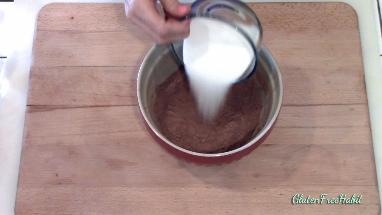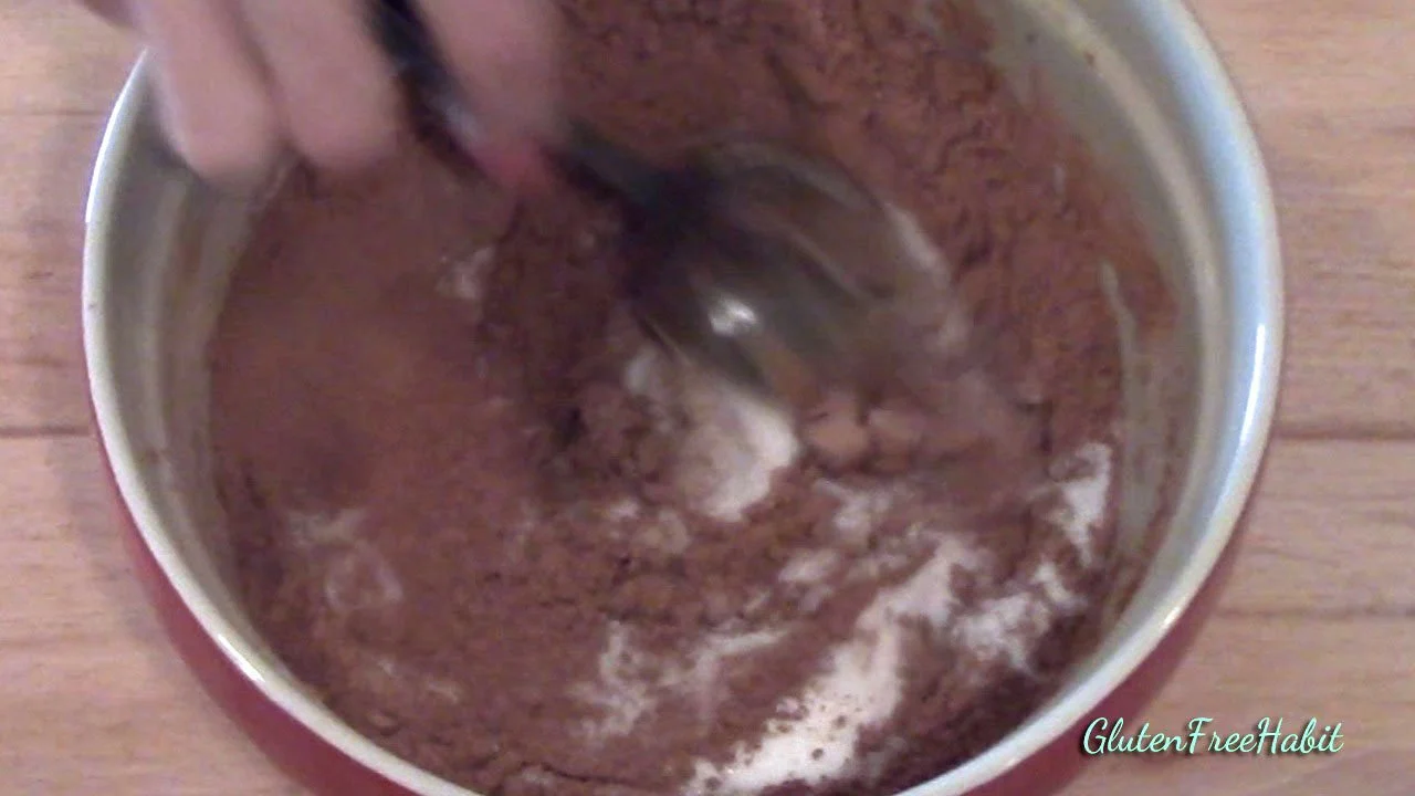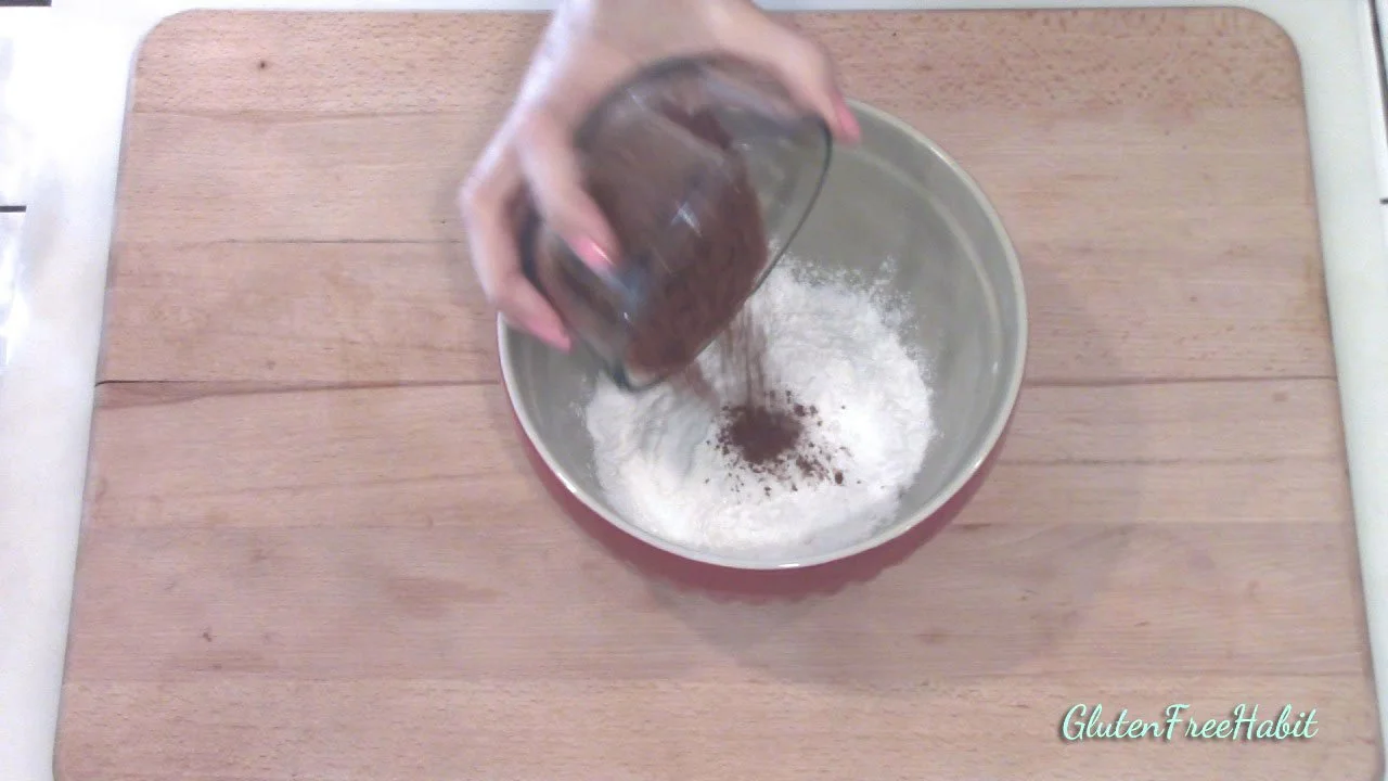 In medium mixing bowl, stir or whisk together the white rice flour, potato starch, tapioca flour, cocoa powder, baking powder, baking soda, and salt.
