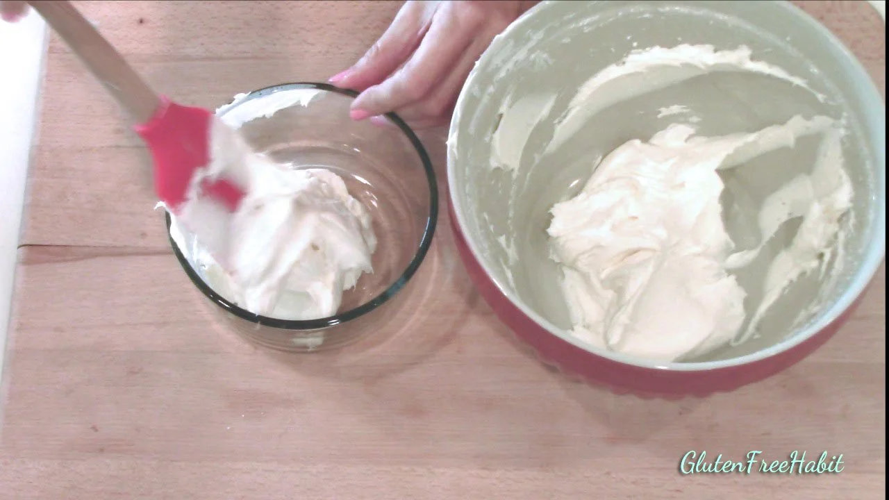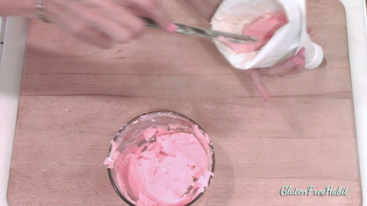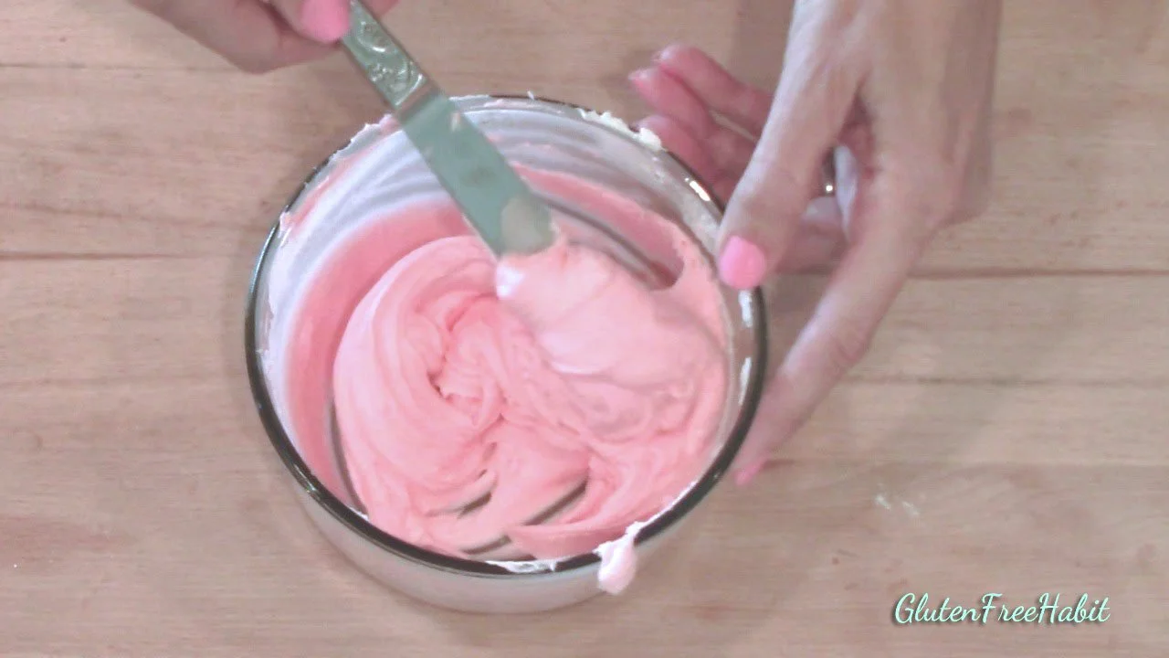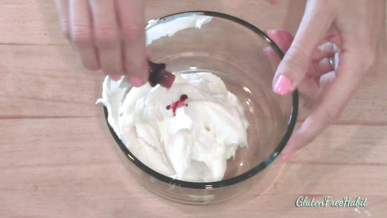 Add GF food coloring to one bowl. Stir well until all streaks are gone.