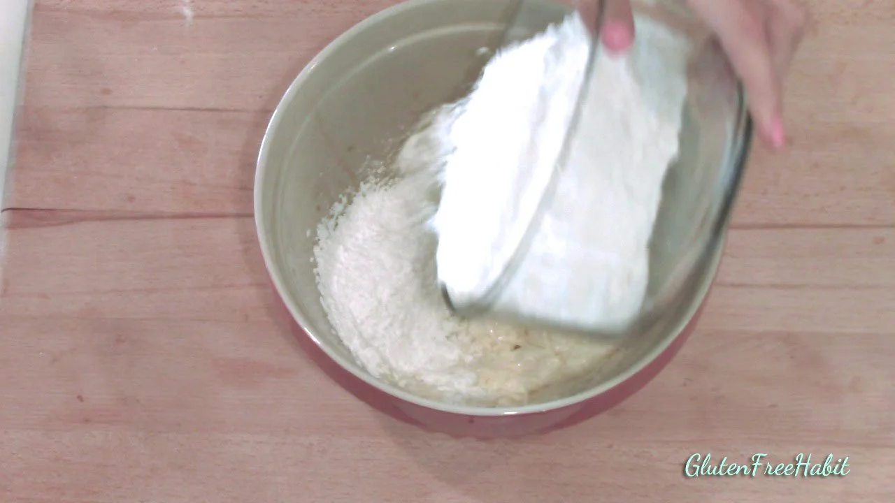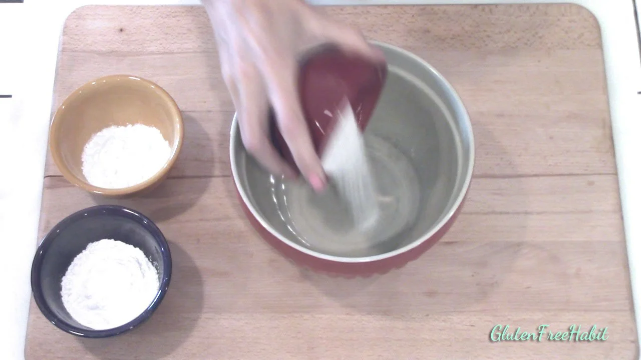 To a medium-sized mixing bowl, add the white rice flour, potato starch, tapioca flour,