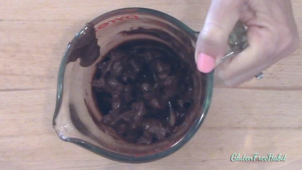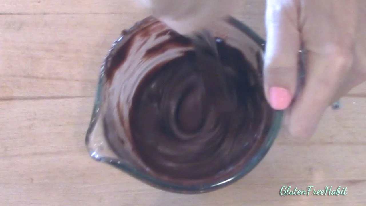 Microwave and stir. This chocolate is 80% melted with chunks of chips remaining. Perfect. Remember, we don't want to melt the chocolate all the way.
