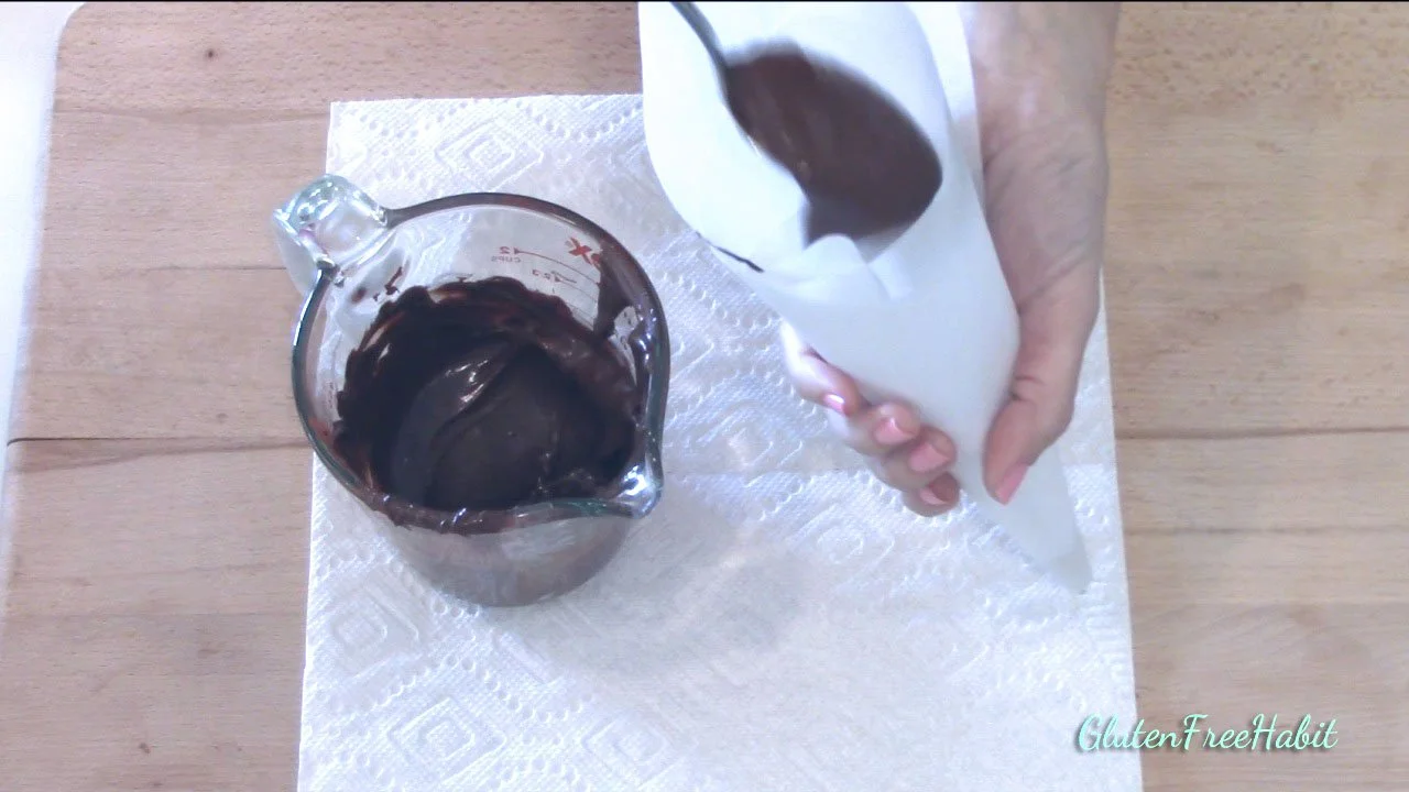 Spoon chocolate into pastry bag. Fold shut. Test chocolate to make sure it comes out smoothly.