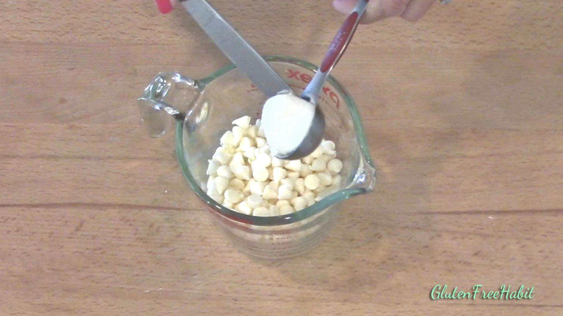 In a microwaveable cup or bowl, add shortening and the remaining ¾ cup of chips.